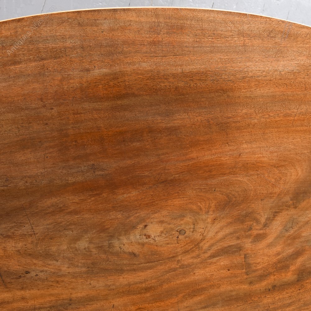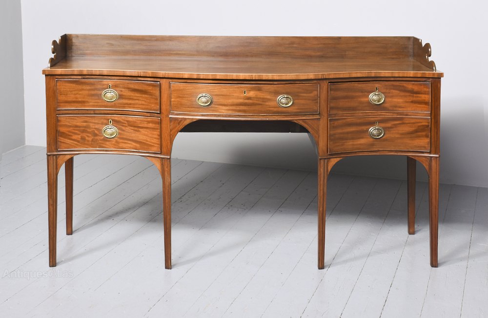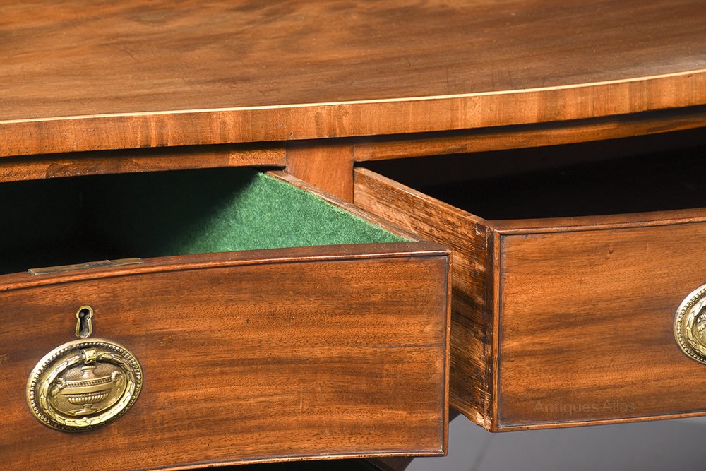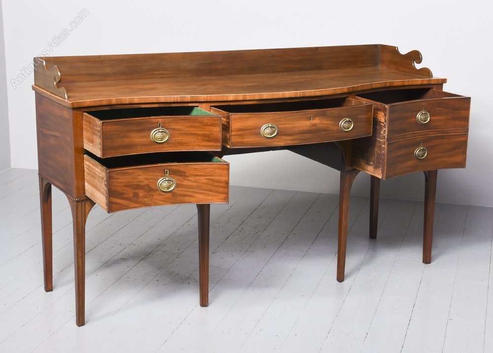 Circa 1800, a late George III mahogany serpentine inlaid mahogany sideboard, ¾ shaped gallery with stylish elegant ends, bow fronted drawer flanked by 2 concave drawers, one been a cellarette, with flame mahogany quarter brackets beneath the central drawer, the elegant sideboard rests on 6 mahogany square tapered legs with beaded fore edges and curved facings.