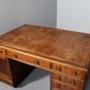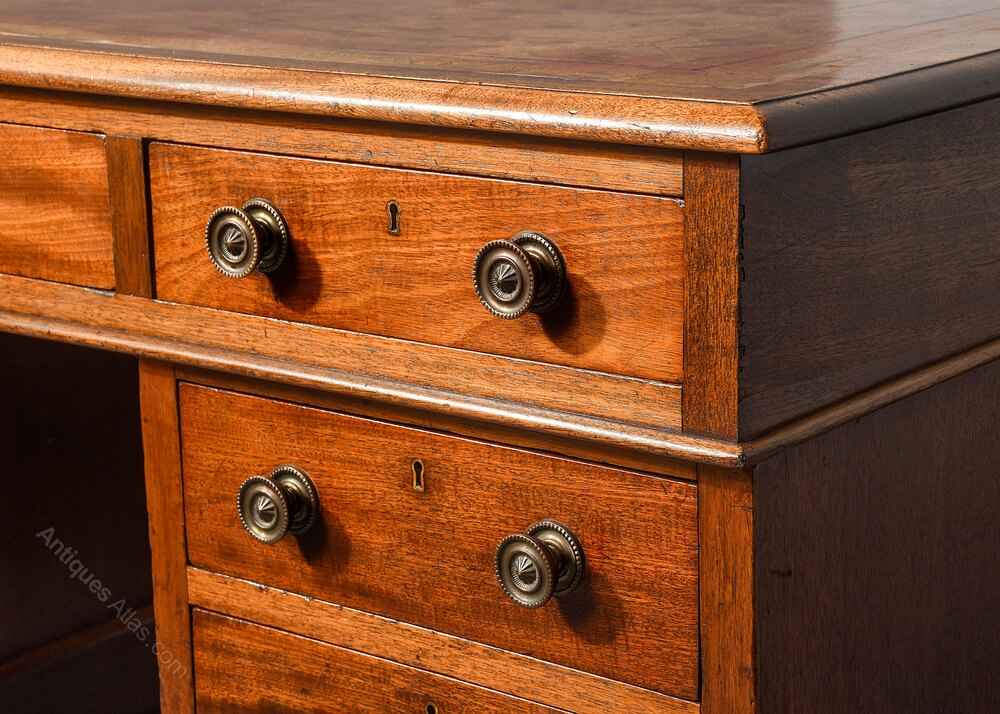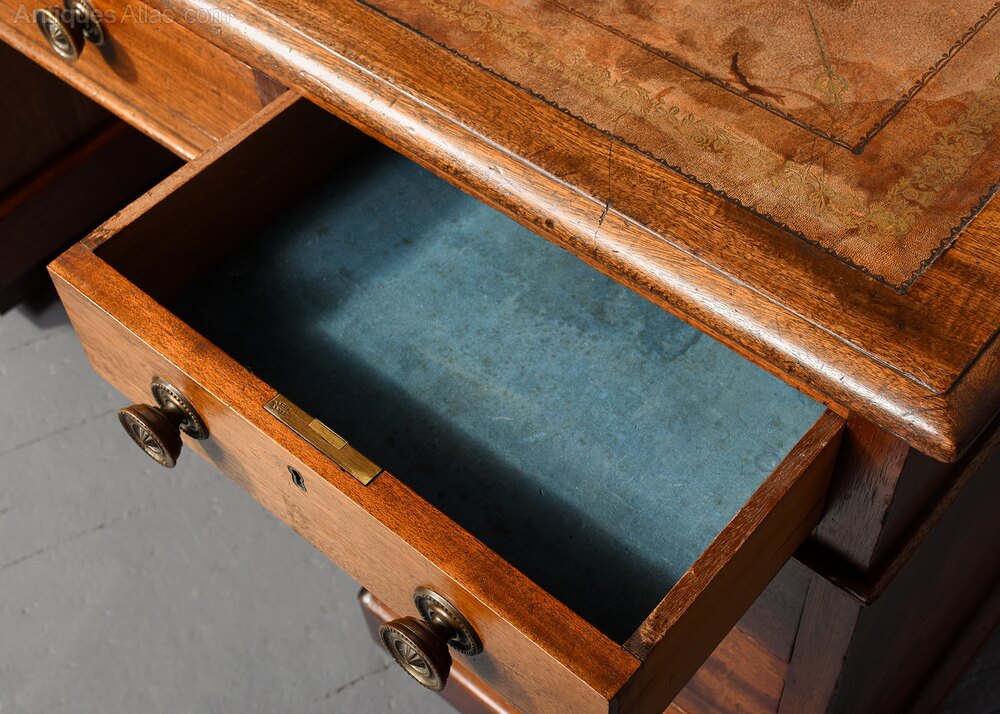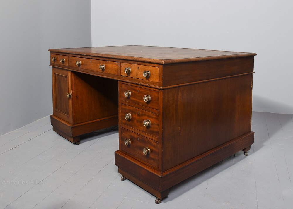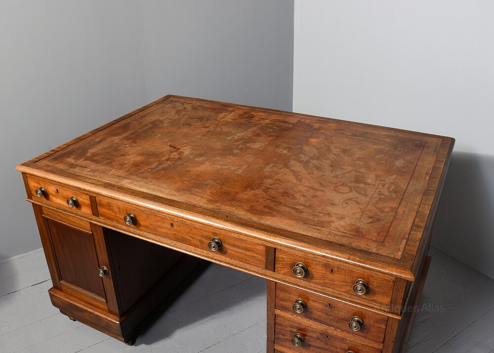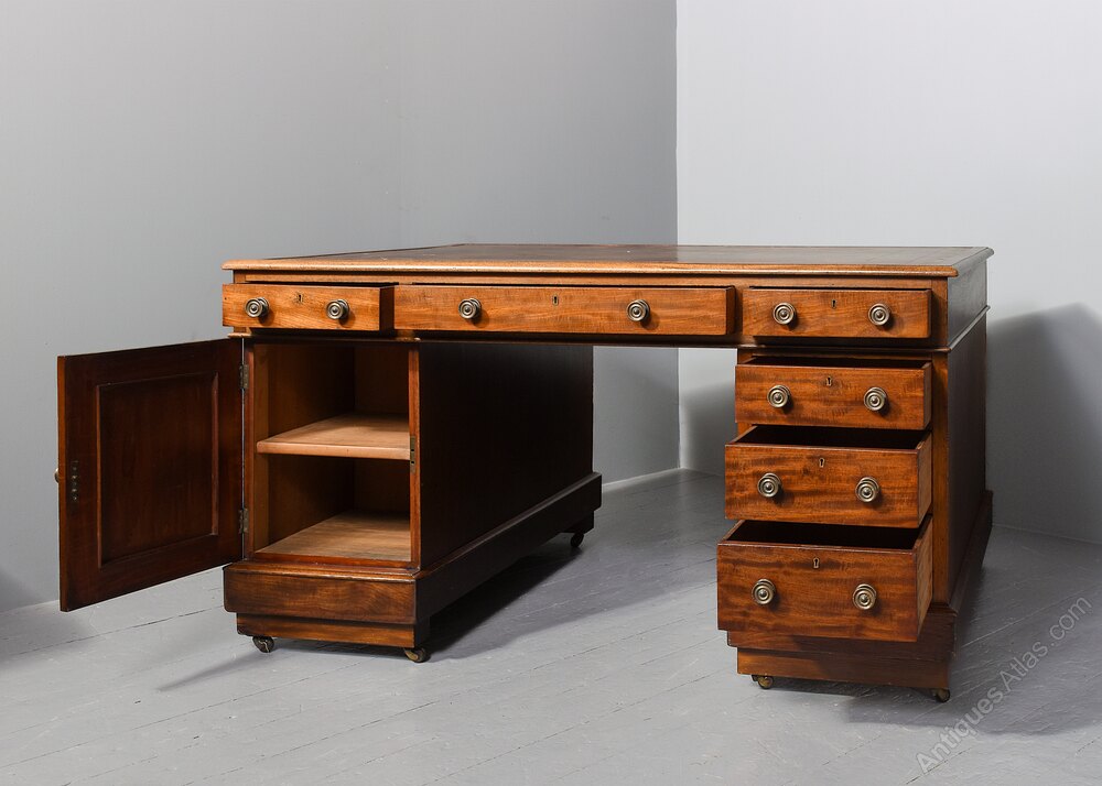 Circa 1860. George III style mahogany pedestal partner’s desk, the top with insert tooled and gilded leather with thistle, roses and shamrocks, with simple banding and moulded fore-edge, the frieze with three drawers, one long drawer flanked by a pair of shorter ones on the front and back, the right hand pedestal with a bank of three drawers with a cupboard opposite, the same on the back of the desk, all the drawers have cast brass circular handles with decorated back plates, the cupboard with a single panel door and a shelf inside, the pedestals are polished on all sides, resting on an enclosed mahogany plinth, with a raised section beneath and the original castors, the desk height can be reduced if required.
