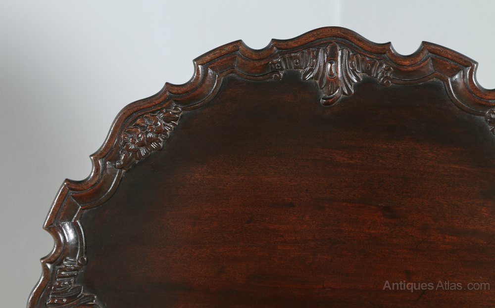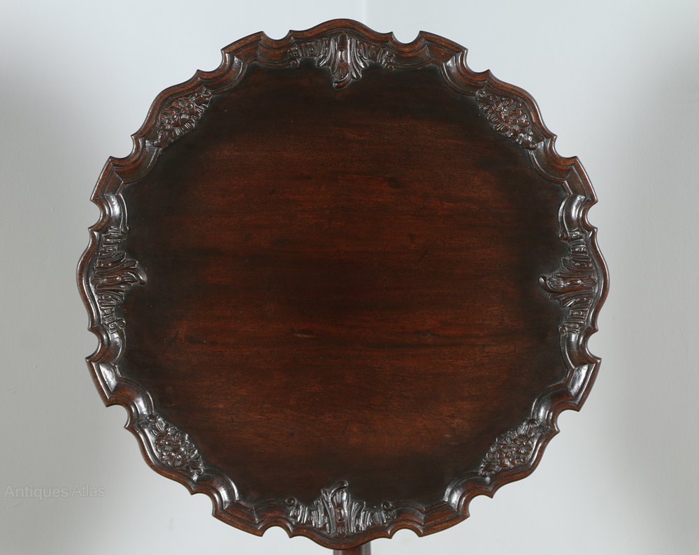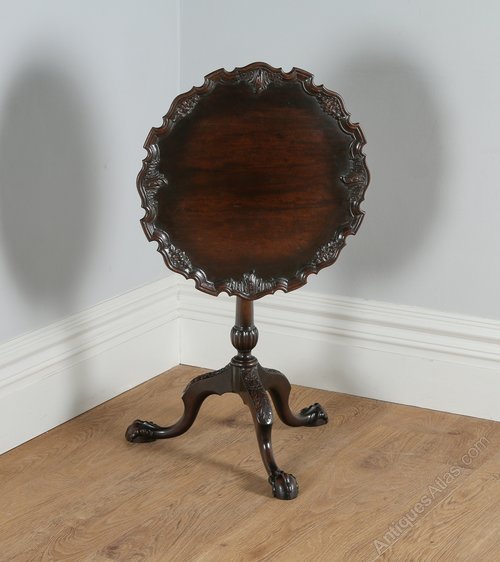Here is a fine quality antique tilt top mahogany piecrust and birdcage tripod table, in the style of the Georgian Chippendale period, circa 1910, in excellent original condition. The top is constructed of solid top quality mahogany and boasts a stunning floral carved piecrust design to the perimeter. The tilt top table features the original hinges and original working brass-locking mechanism this locks the table into place when horizontal. Below, sits a four-pillar birdcage structure with a central wooden peg that connects the table to the pedestal. This bird card design allows the top to rotate. If the peg is removed, the table can be dismantled. The birdcage mechanism has been superbly made and the design denotes the quality of components used in the construction of this table. The table features a well-shaped and very good quality turned pedestal stem, featuring a bulbous section to the top, which incorporated floral blind fretwork detail. The stem terminates on an elegant fluted urn above three cabriole legs, which boast acanthus leaf carvings to the knees. The legs stand on well-carved ball and claw feet (sign of quality).