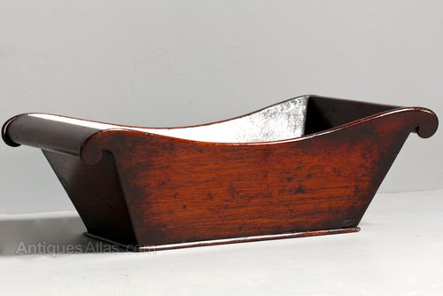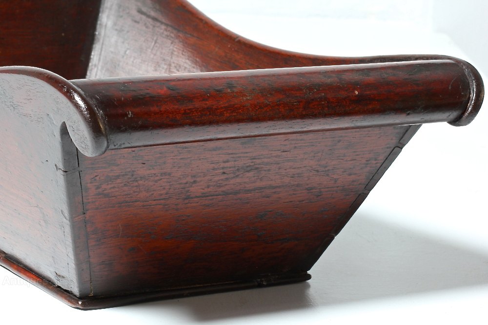 An unusual late 18th century deep treen tray/dish in mahogany. It is bateau shaped, rectangular with tapered and curved sides. The ends are elegantly scrolled. Of fine dovetailed construction, it has a flat nailed base. In lovely condition, with a good original surface, this is a fine example of domestic treen. Circa 1780.