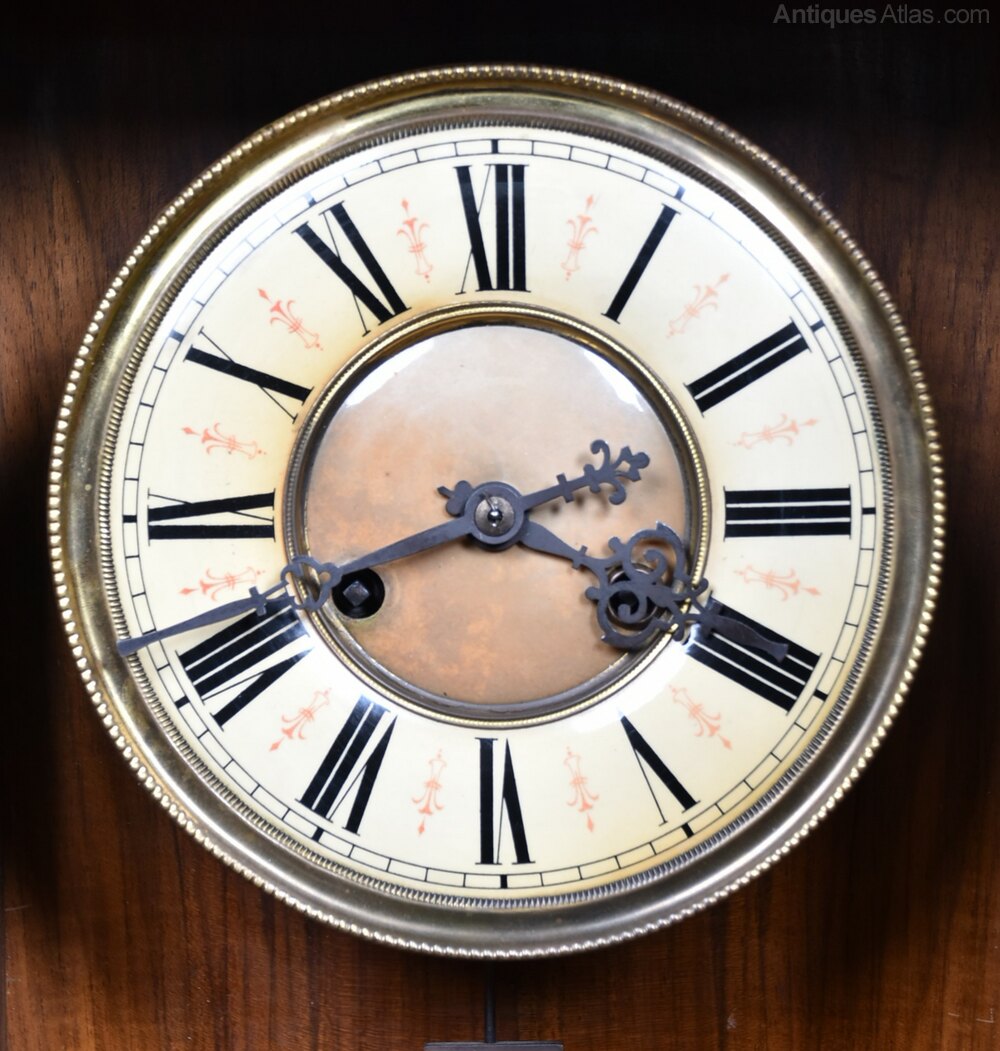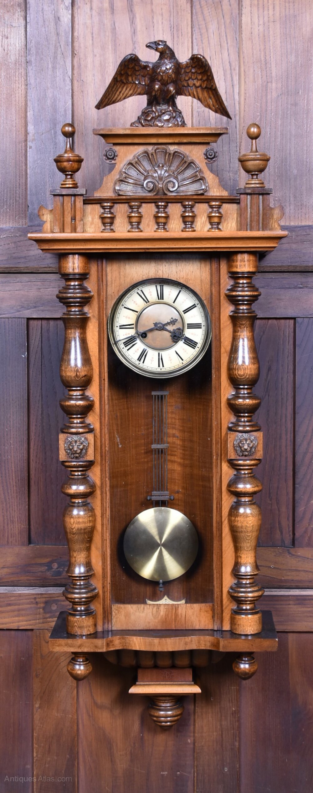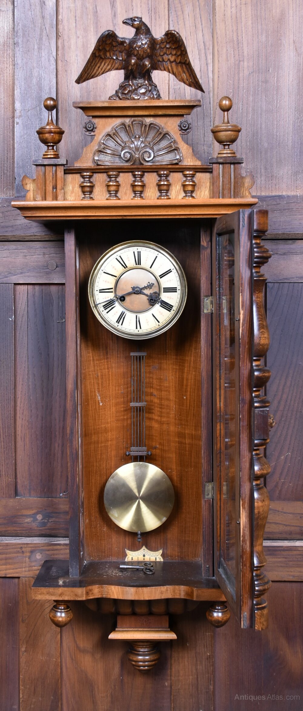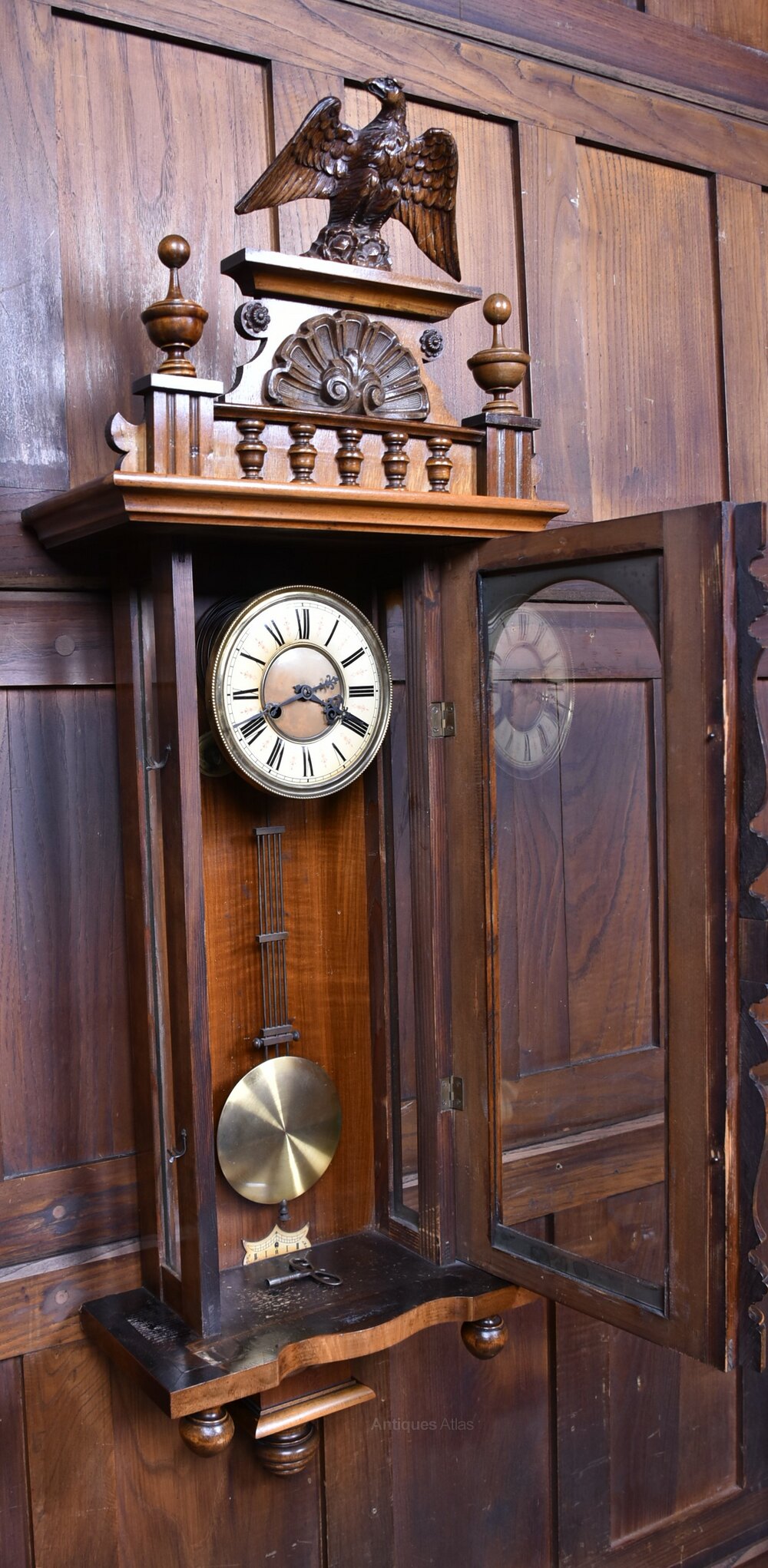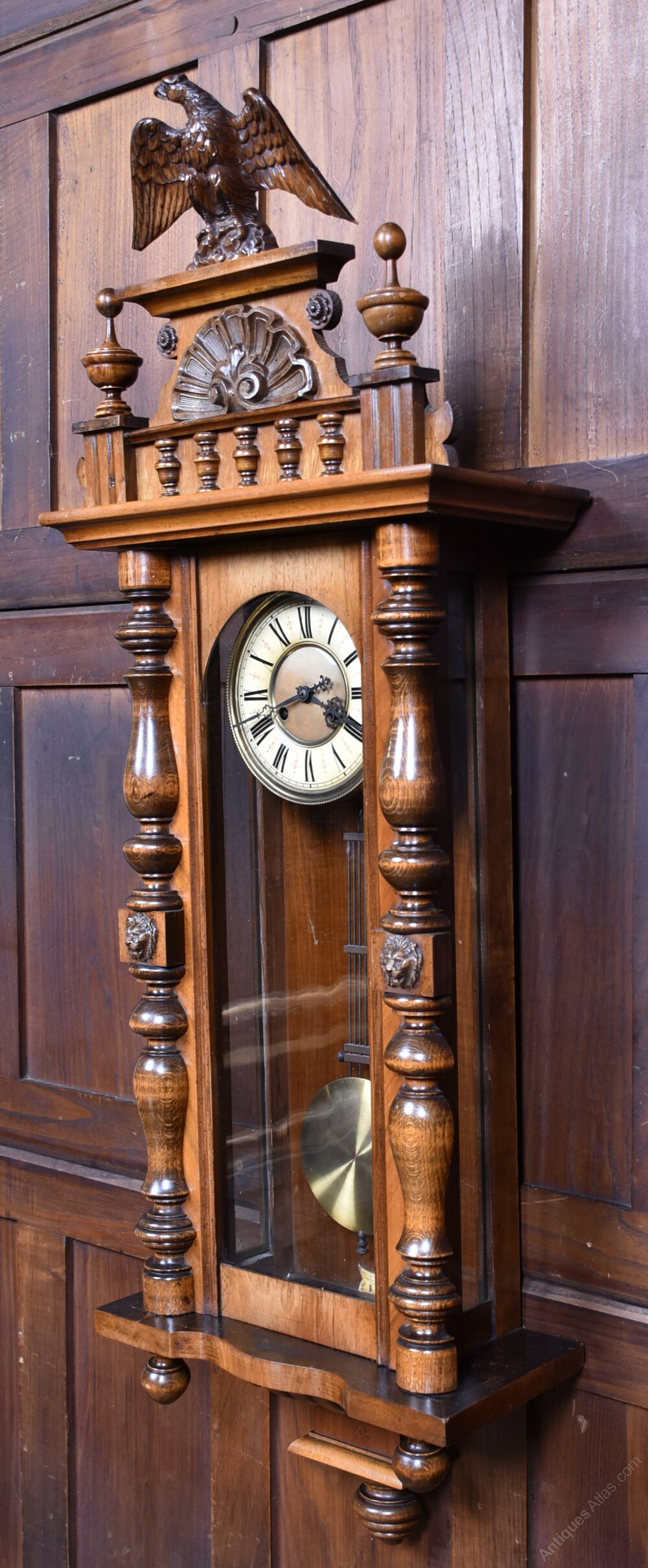 A handsome German wall antique clock, spring-driven and finely carved with an impressive a sculpted eagle crest. The case features ornate detailing, including turned columns and finials, all rendered in richly toned wood that speaks to its late 19th or early 20th century origins. The circular dial measures 16cm across and displays Roman numerals in crisp contrast, framed by a glazed bezel. Below, the pendulum is housed within a shaped wooden compartment, adding vertical emphasis to the clock’s stately silhouette. In excellent working order, this timepiece keeps good time and offers both decorative charm and mechanical integrity—ideal for traditional interiors or collectors of European horology.