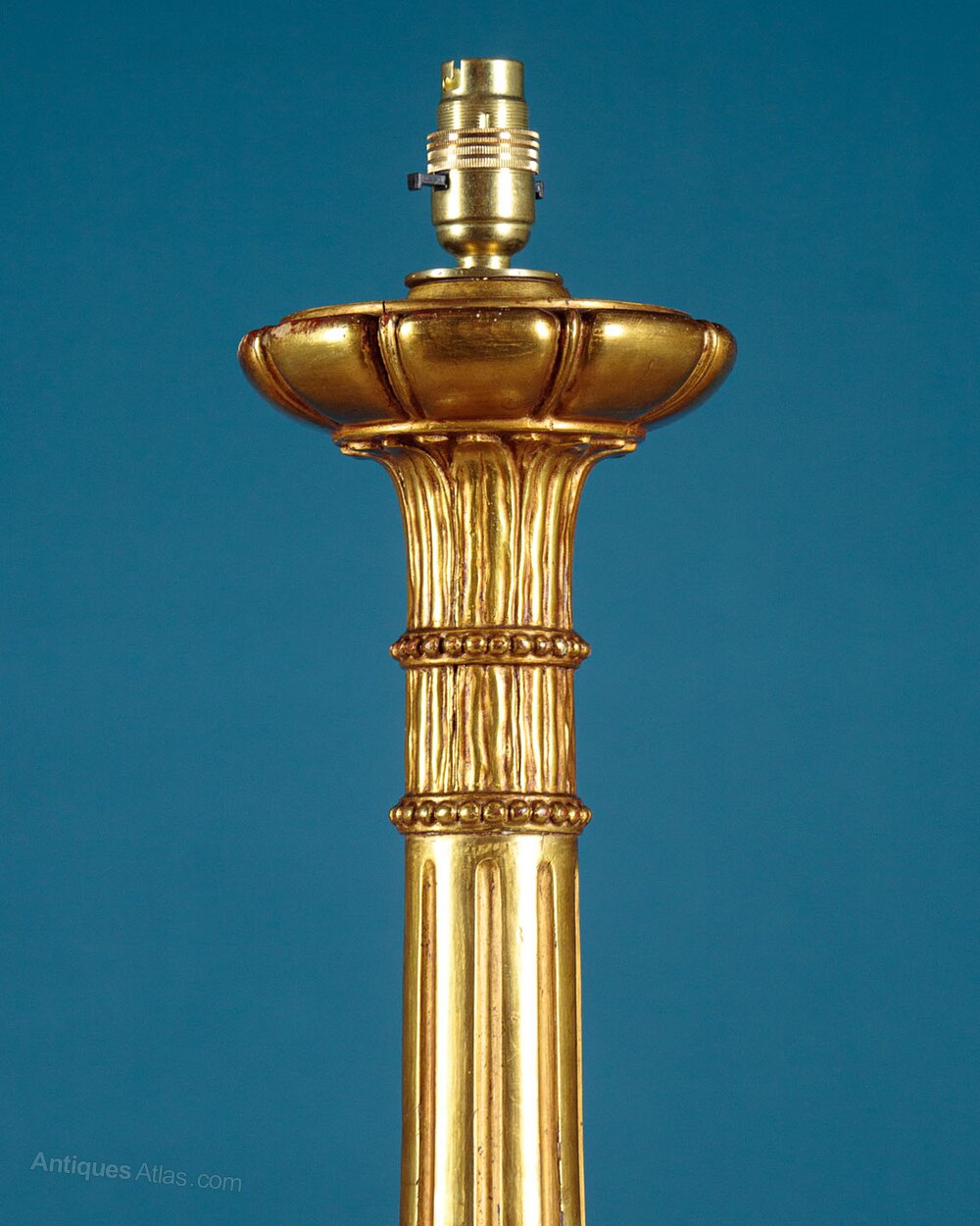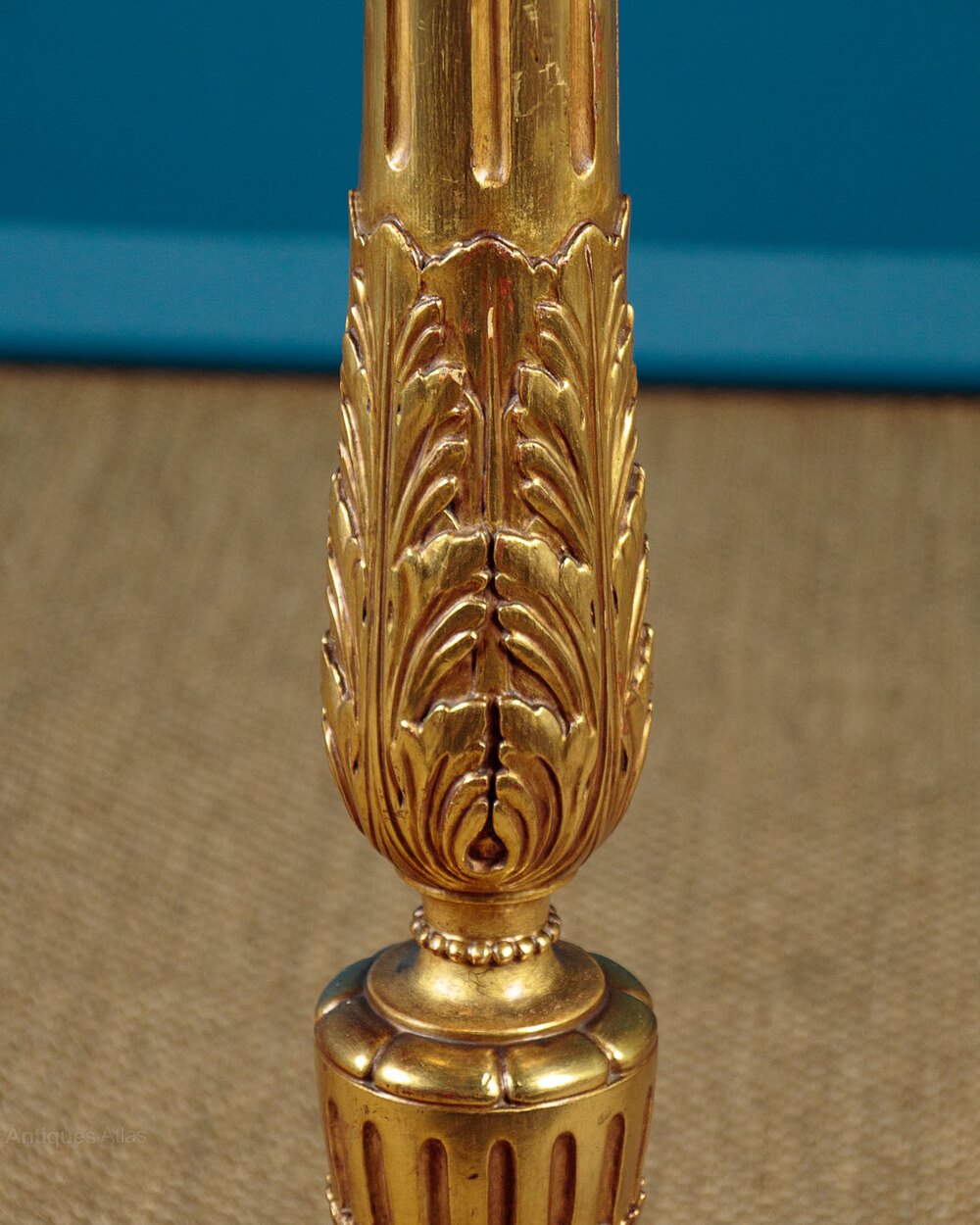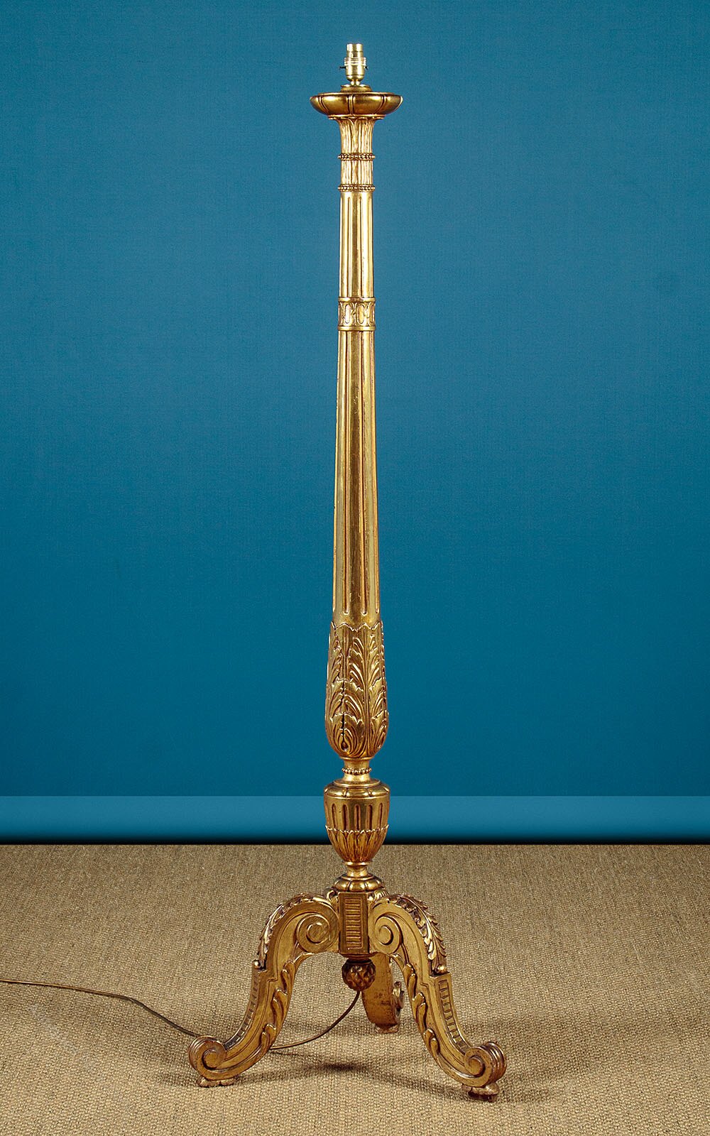 Splendid giltwood standard lamp c.1930. Single bulb on a carved and gilded column modelled after a George II torchere. Turned and fluted with acanthus and papyrus leaf detail and raised on scrolling acanthus legs. Excellent condition with the original gilding. Cleaned rewired and PAT tested.