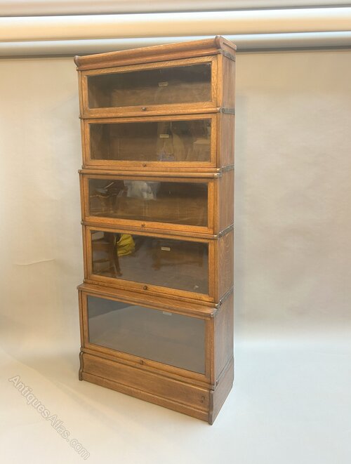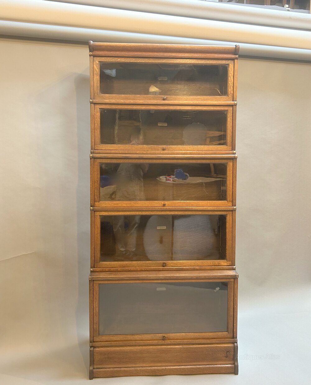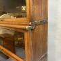 early C20th oak of warm colour, the cornice over 5 graduated and stepped sections with glass doors, raised on plinth base.
