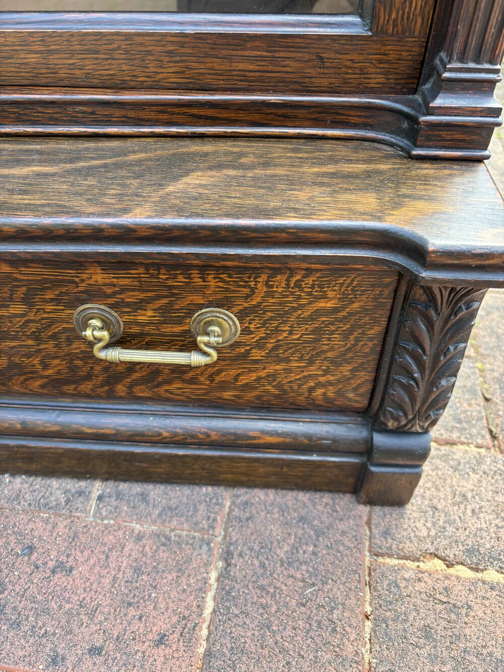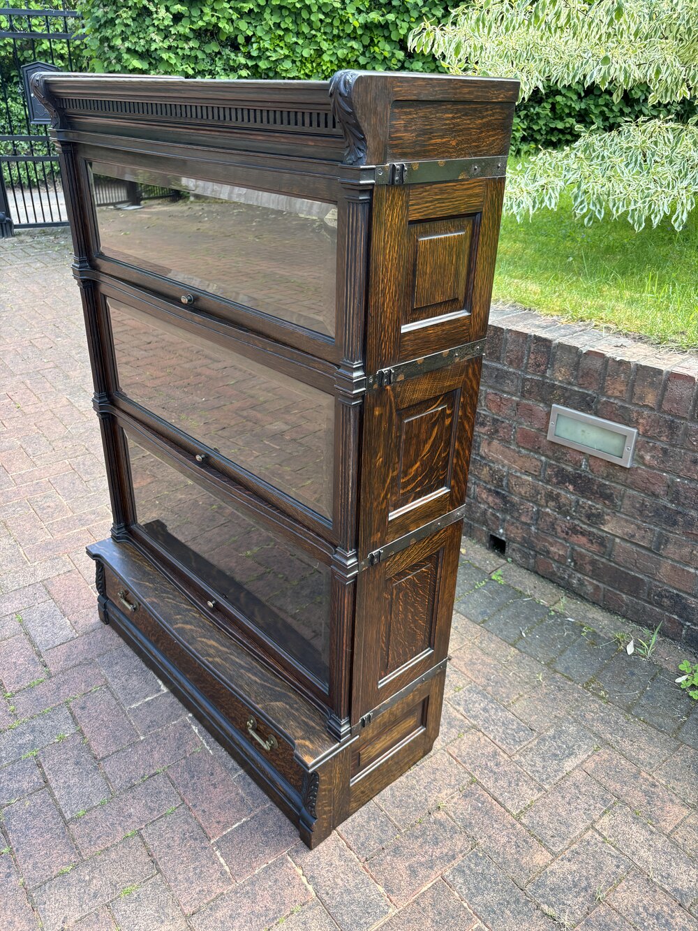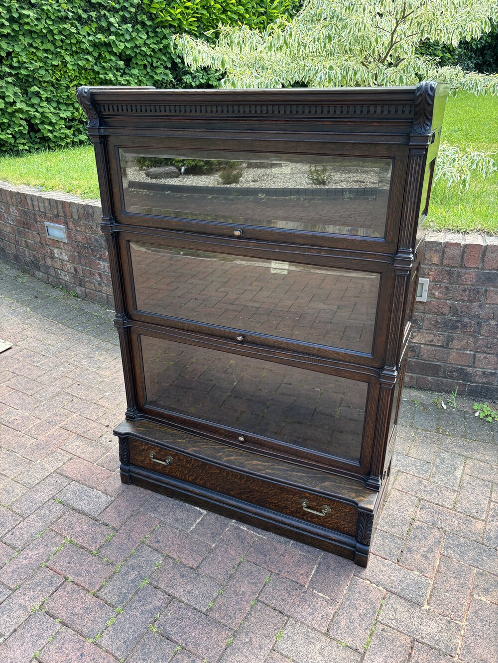 A very attractive Globe Wernicke sectional bookcase, constructed of quarter sawn oak. The top section with dental cornice and carved acanthus leaf corbels, over three glazed sections having their original clear bevelled edge glass, and reeded side supports. The lower drawer has brass handles and acanthus leaf carving on each side. Each section bears the makers label.