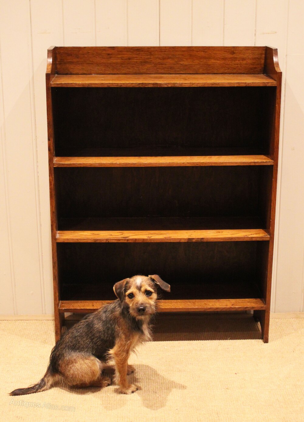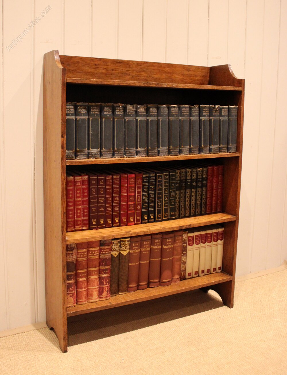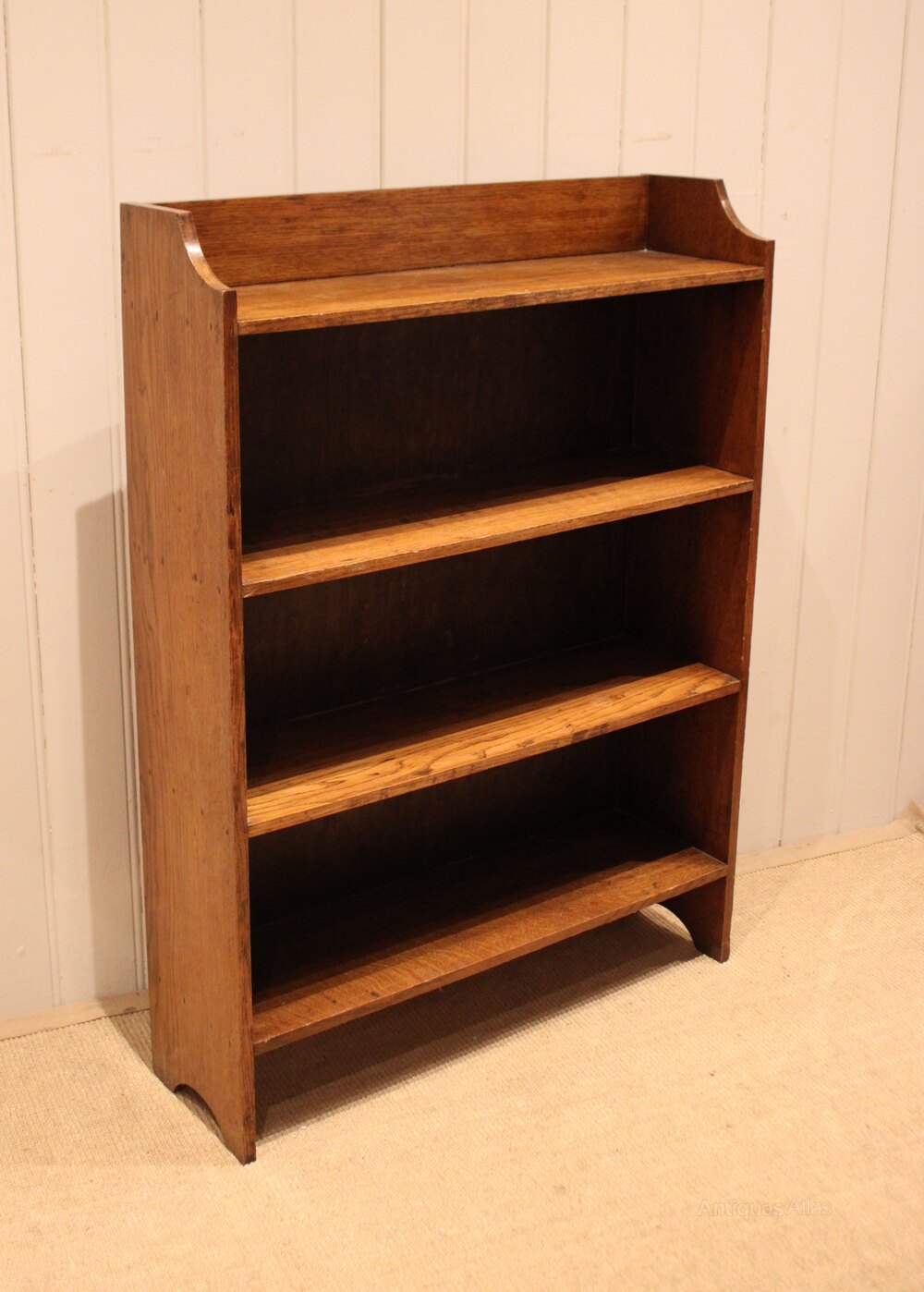 Golden oak open bookcase having three fixed shelves with a shaped top , raised on side brackets . The shelf dimensions are 74.5 cm wide , 21 cm deep and from the bottom up 24.5 cm high , 25.5 cm high and at the top 25.5 cm high .