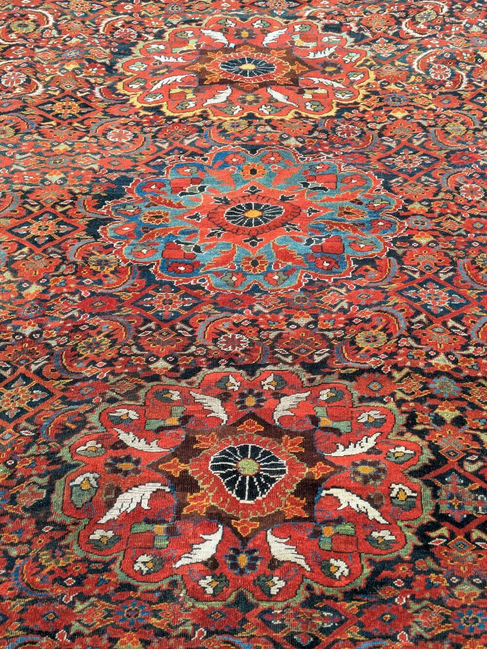 This is a good antique Khamseh carpet with a lovely design and attractive colour palette dating from around 1900. The deep indigo Herati field is centred by three polychrome flowerhead medallions, framed by spandrels and borders of meandering vines, flowers and palmettes, flanked by ivory guard stripes.