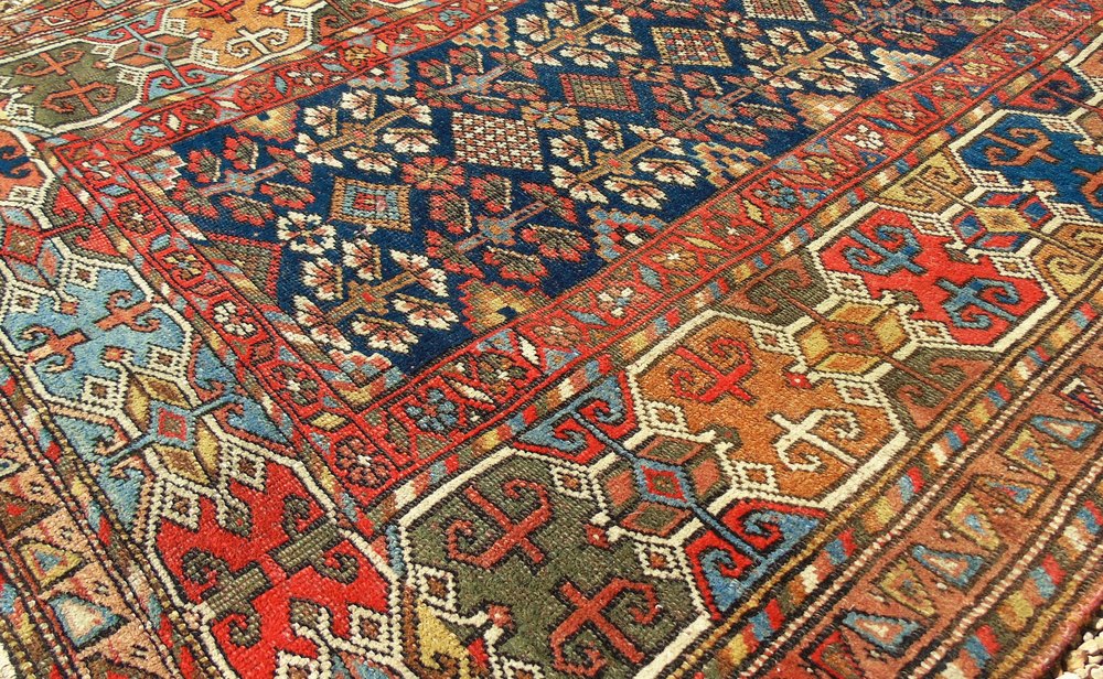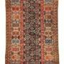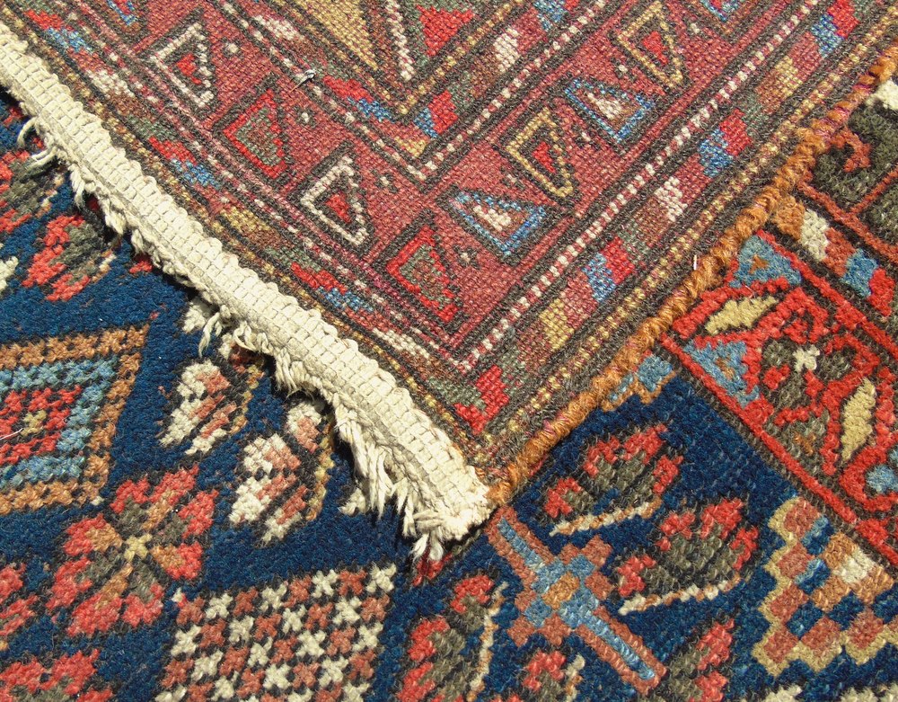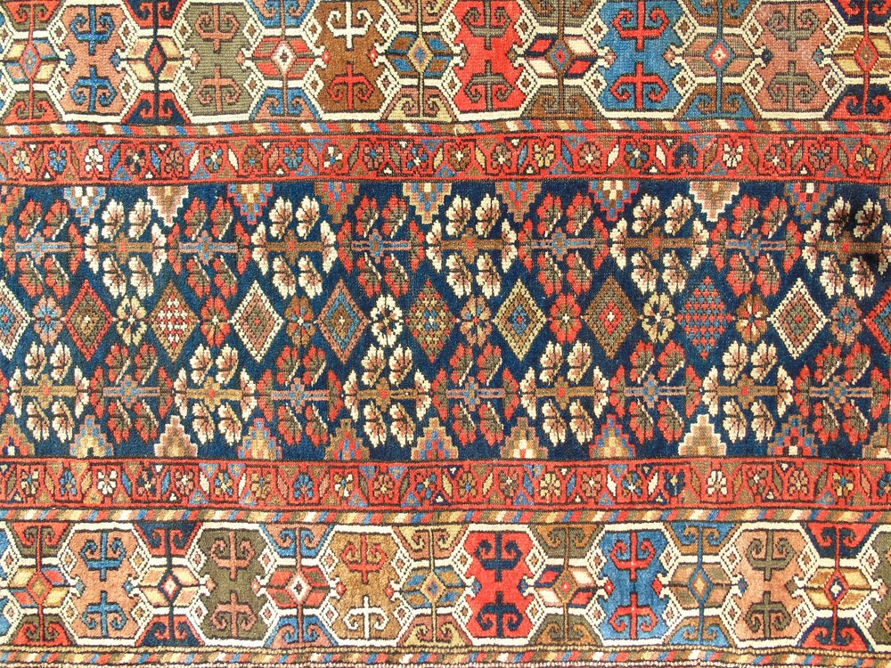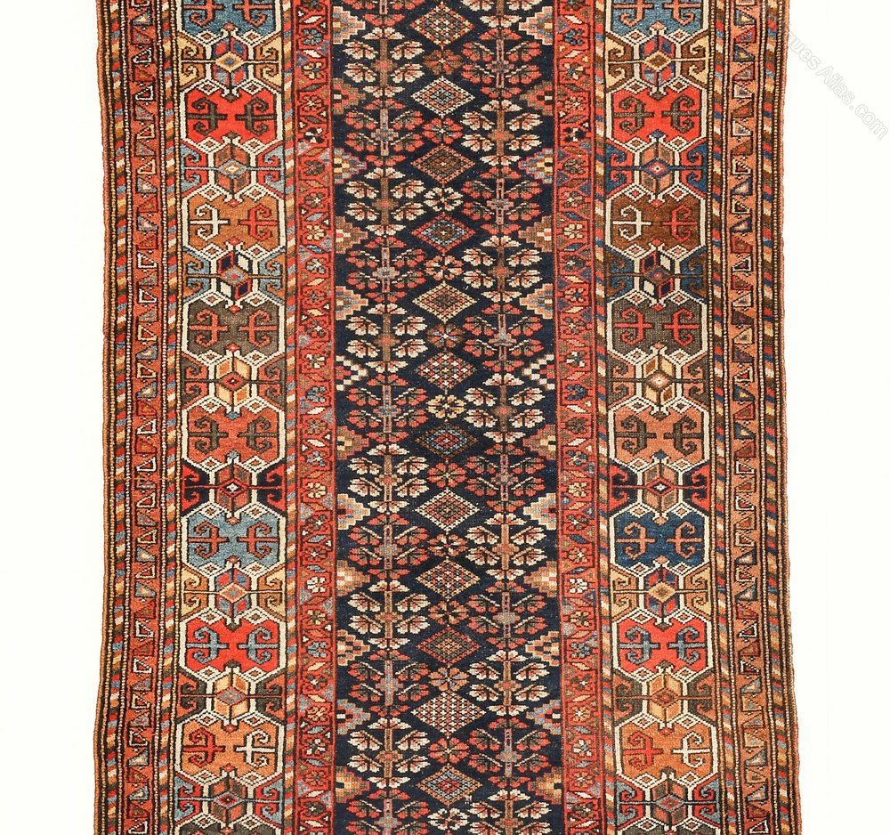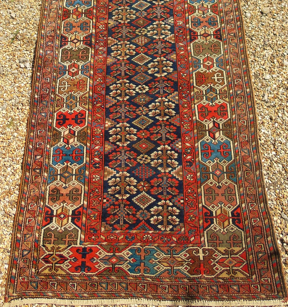 This is a very good Kurdish runner dating from about 1920. The runner has a fabulous colour palette the rich indigo field with columns of diamond medallions and flowering plants enclosed by colourful geometric borders flanked by carnation guard stripes. This a nicely drawn example which is in really good condition for the age. It has good selvedges, an even low pile throughout and just a little wear to the ends.