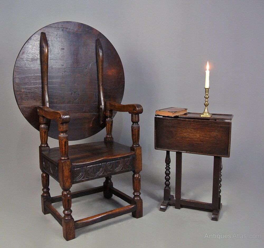 The oak cut to reveal the feathery and gleaming medullary rays. The arm supports carved in the Elizabethan manner and the table very solid and robust throughout.