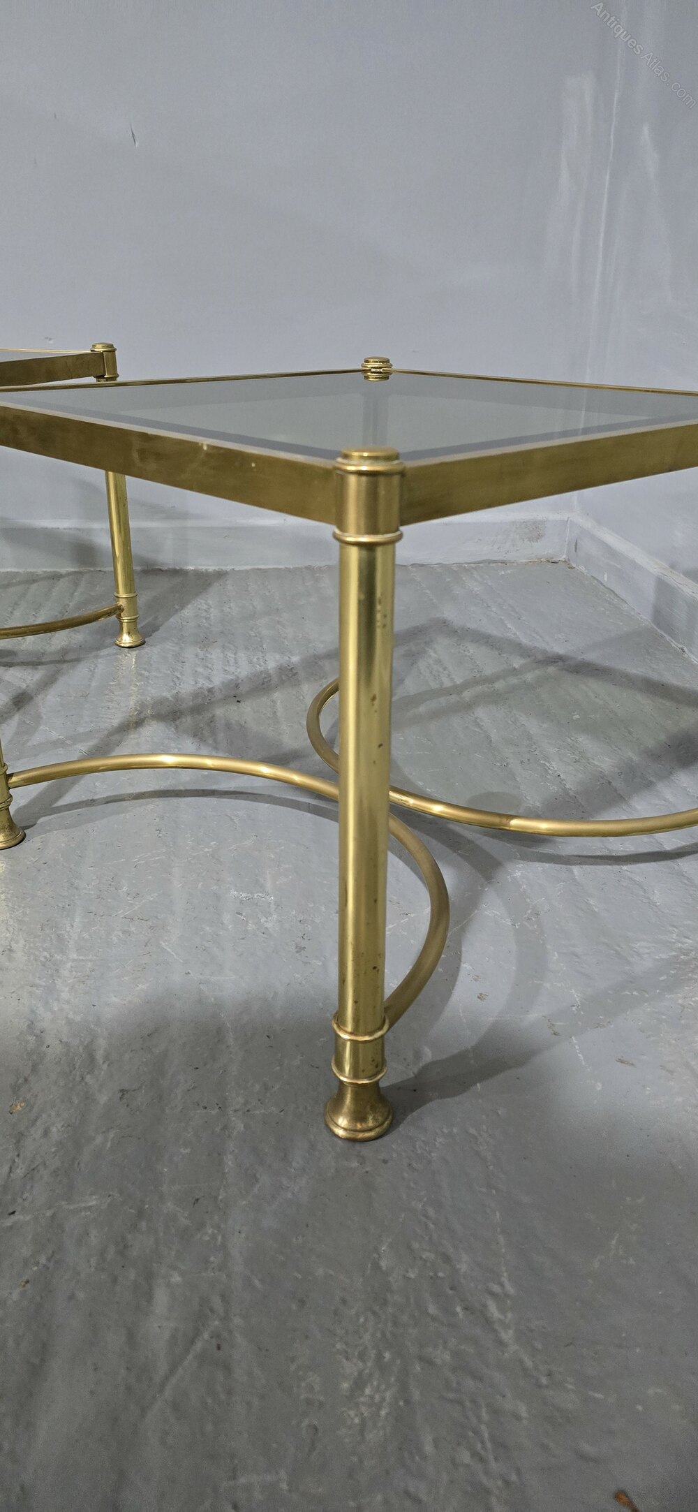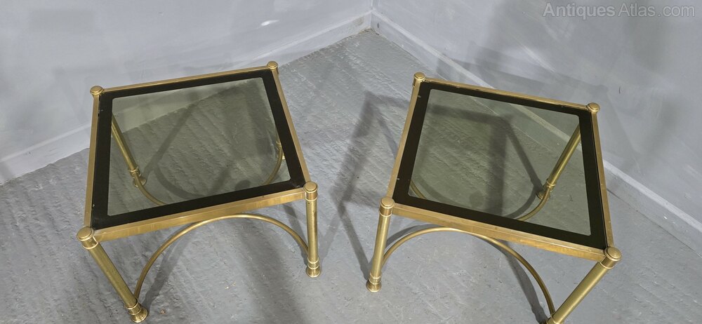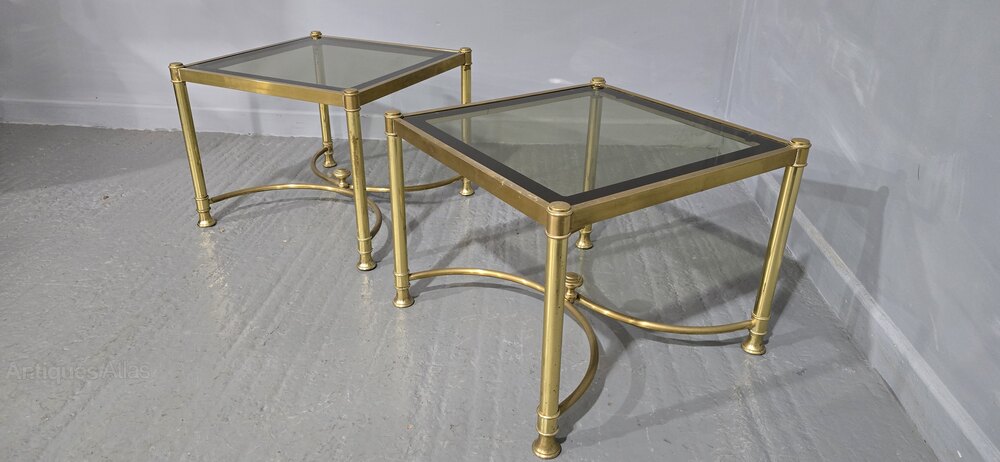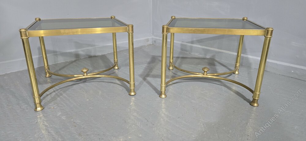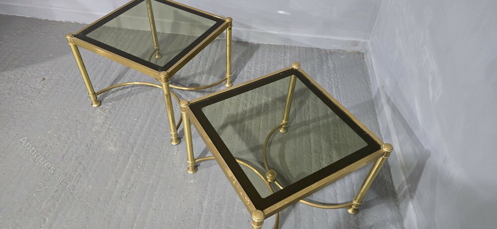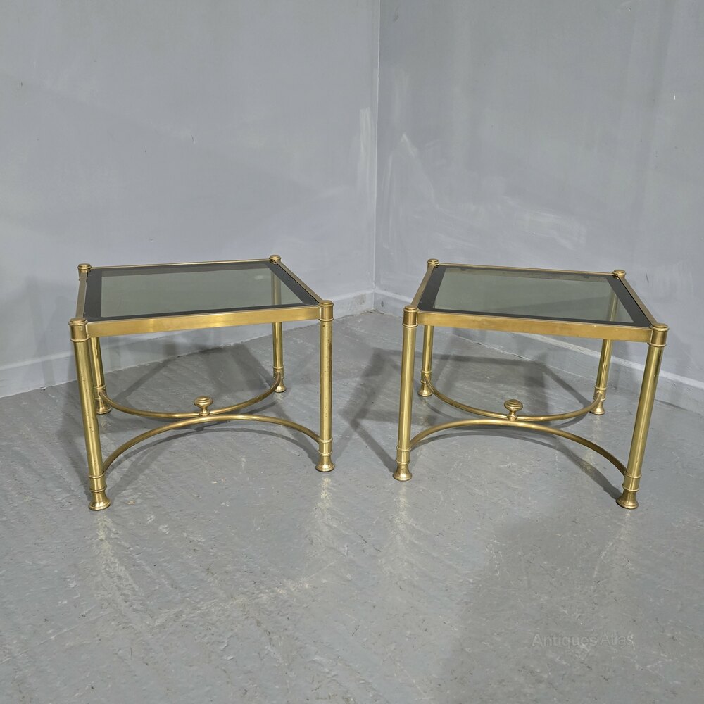Very nice pair of brass occasional lamp antique tables, with smoked glass tops, in good overall condition.