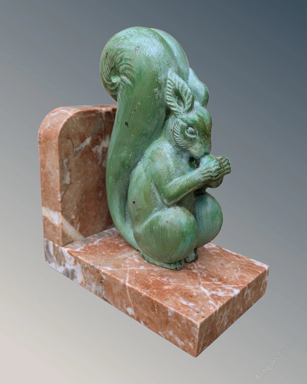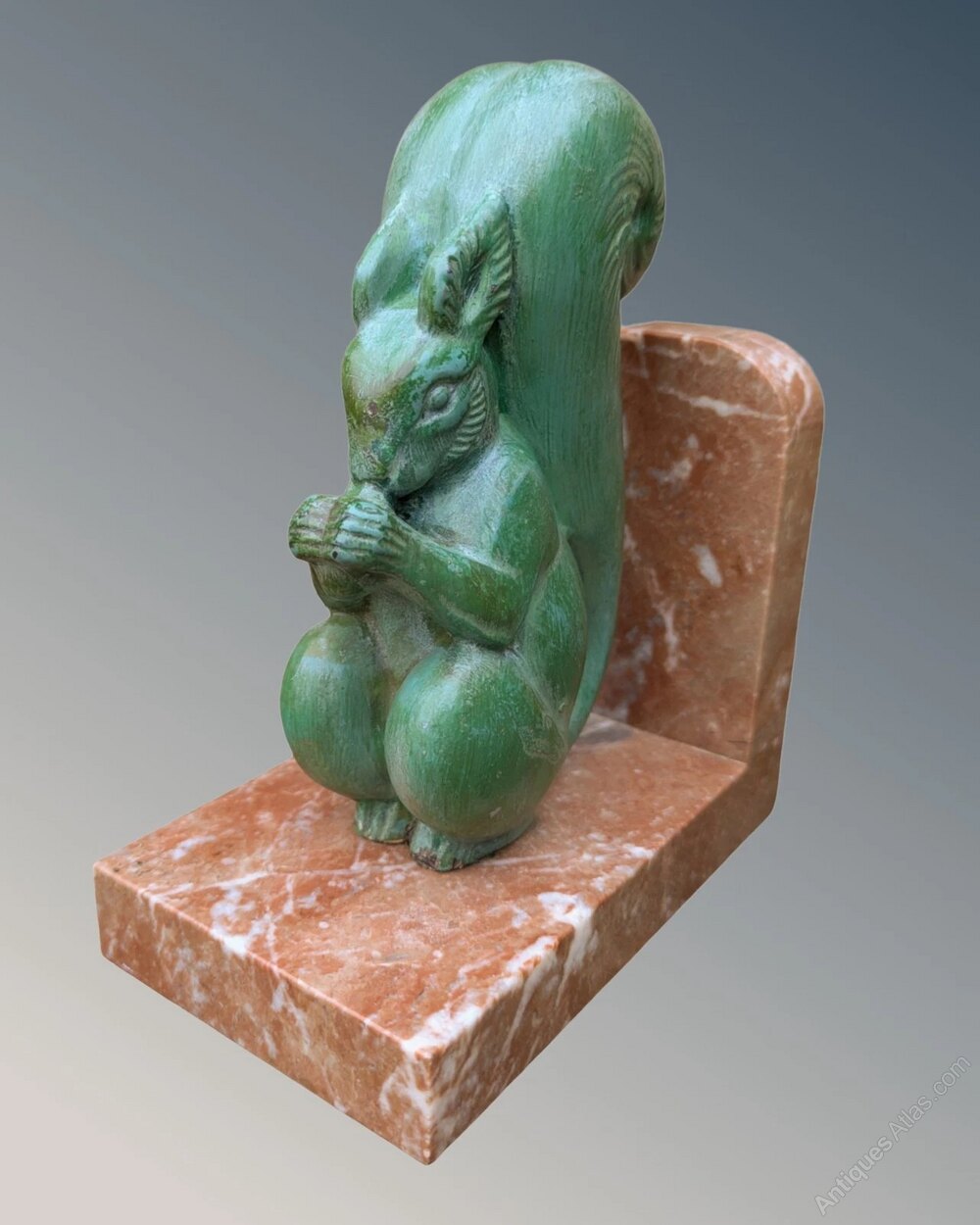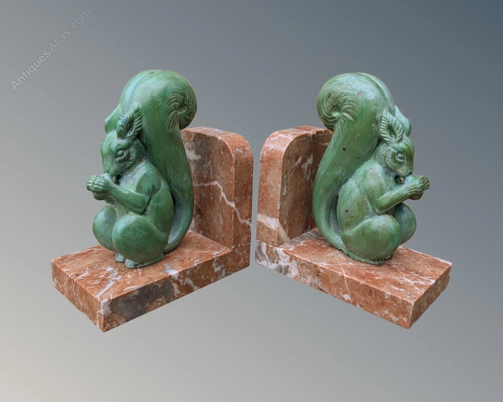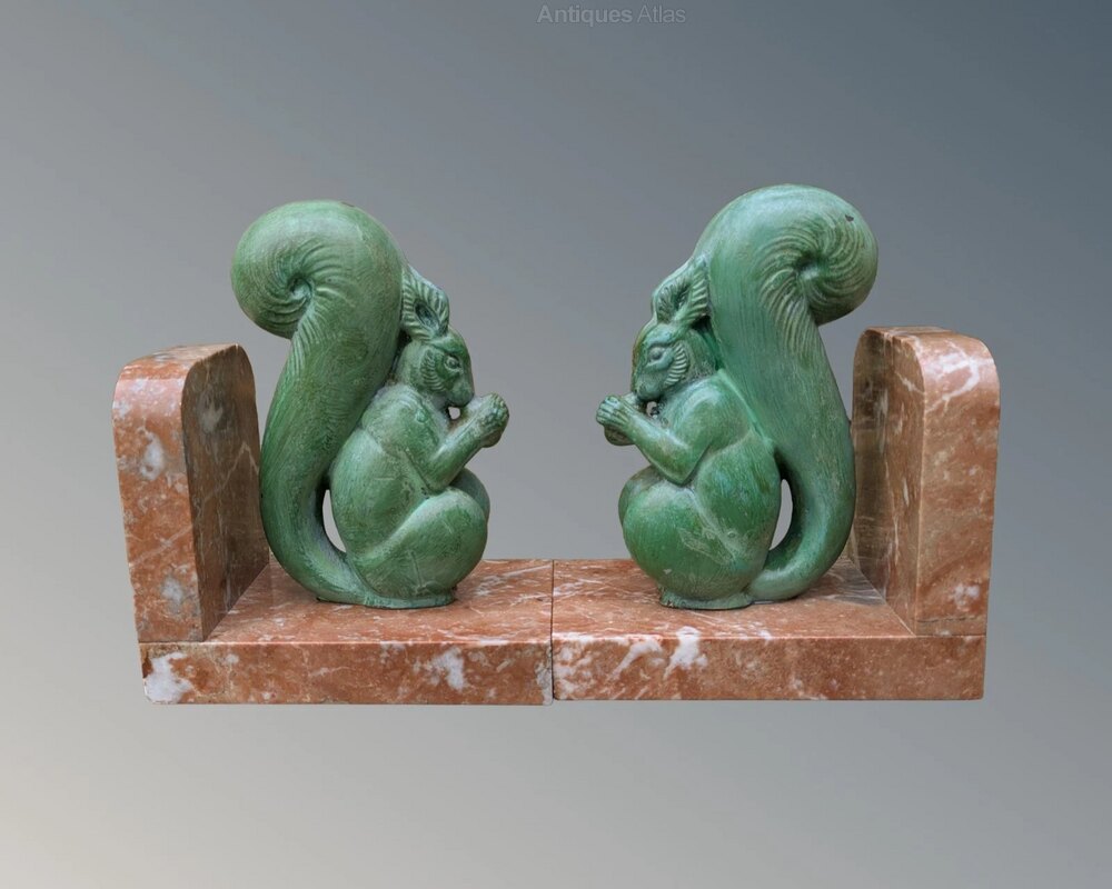 This is a lovely pair of Art Deco bookends with charming stylised bronze squirrels in a beautiful soft green verdigris finish.