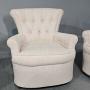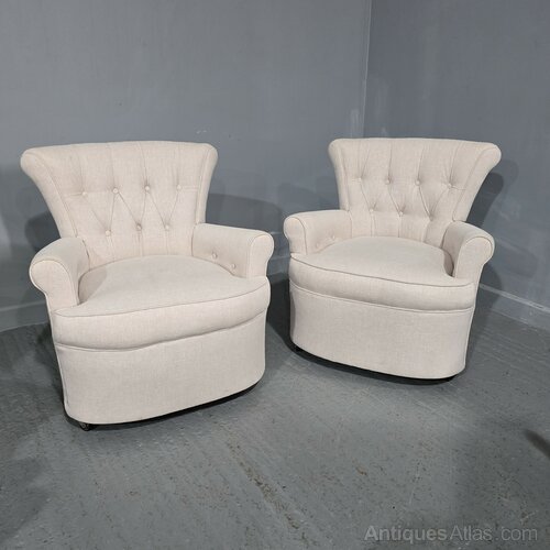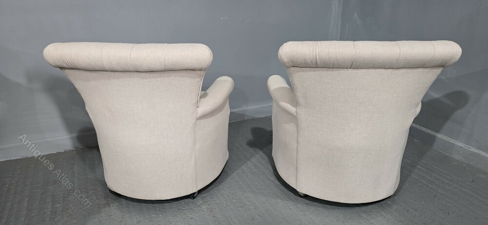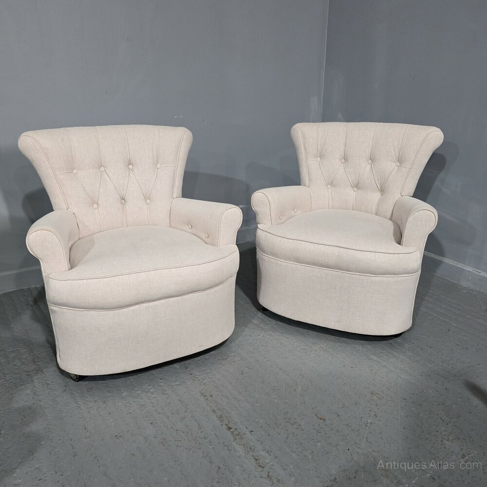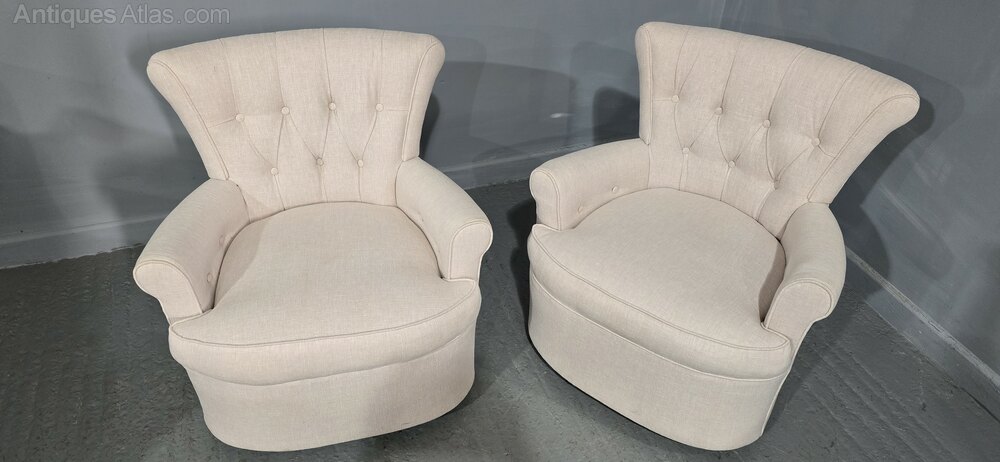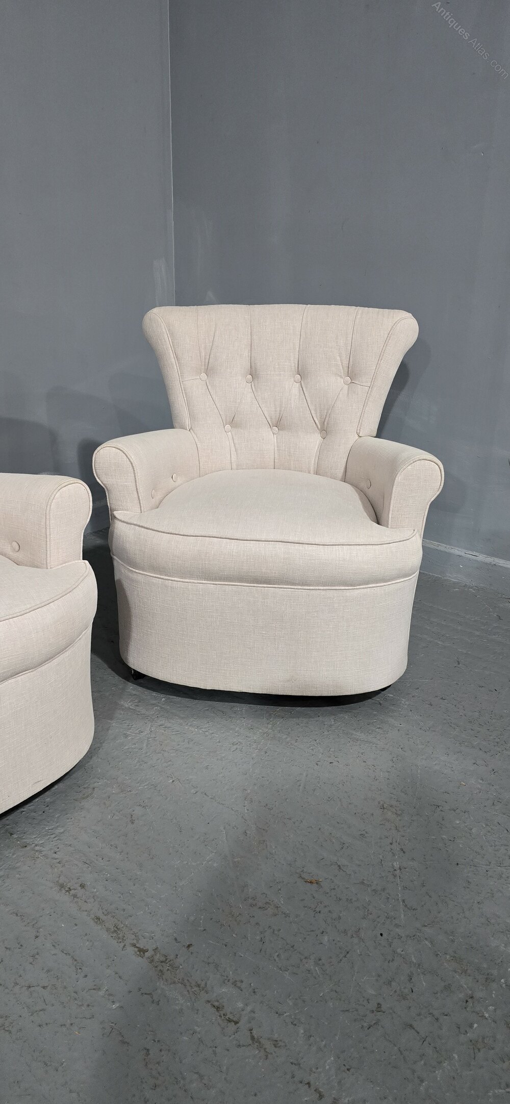 Very nice pair of cream linen covered deep buttoned boudoir chairs, in excellent overall condition.