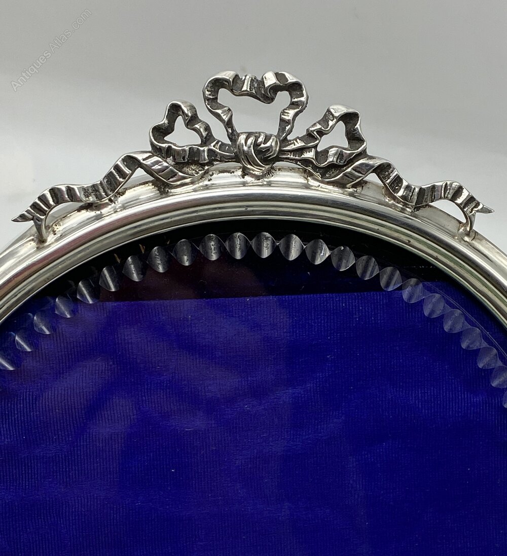 An large exceptional Quality Circular Silver Photo Frame Surmounted with Bows and Ribbons.The Glass has unusual 'cuts' around edge which reflect well from the Silver.Dimensions are 16.5cms Max.Replacement Satin Ribbon support.Full Hallmarks Sheff 1902 for Joseph Rodgers.