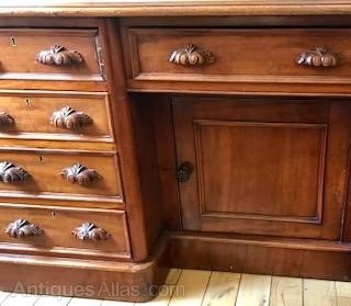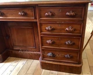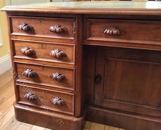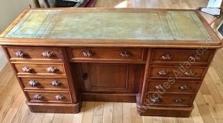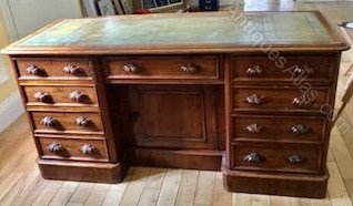 Good quality Victorian solid mahogany kneehole desk. The drawers of a good hand-cut dovetailed construction with solid linings and well carved handles. With a useful locking and panelled central cupboard. With an old green leather top. Shown prior to restoration.
