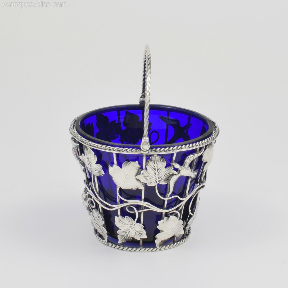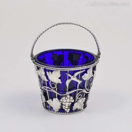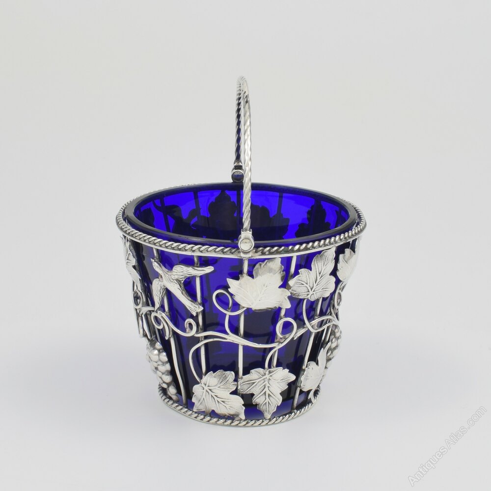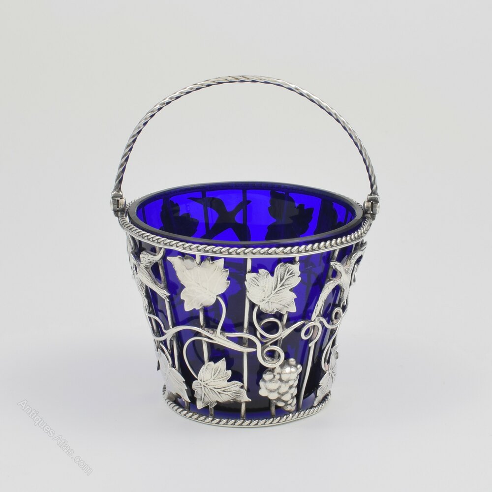 A very pretty George III silver wirework cream pail or small sugar basket with a vertical frame adorned with a scrolling grape vine applied with leaves, grapes and birds in flight. Rope twist edge to the rim and foot and a cast rope effect swing hinged handle. Fitted with a blue glass liner. Unmarked it has been tested as silver for completeness. Dating to c.1760-1770, probably London.