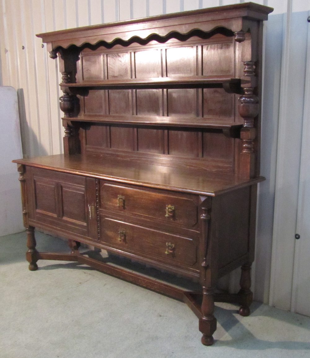The base of the dresser has a counter top with a moulded edge, the cupboard has a panelled moulding on the door front as do the two drawers two drawers on the right side, these are flanked by carved turnings on each side matching the columns on the dresser top. The dresser stands on turned legs, and they are joined by an heavy X shaped stretcher
