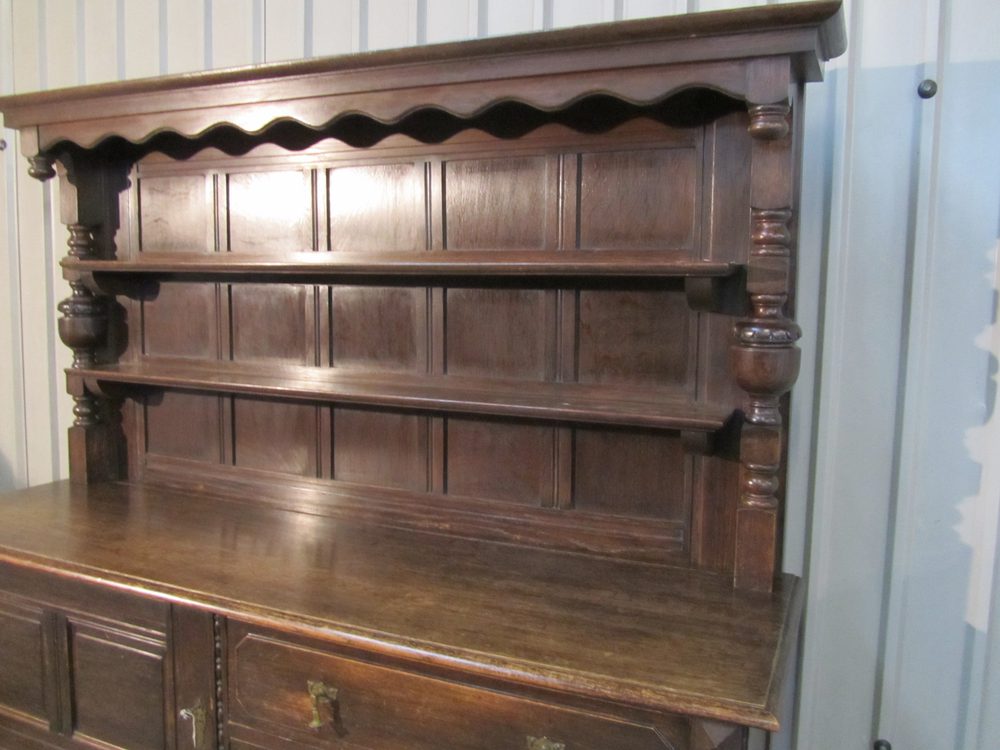 The dresser top has a classic styled top with an outward sweeping cornice which has a scalloped frieze and teardrop turnings, the plate shelves have grooves carved into them.