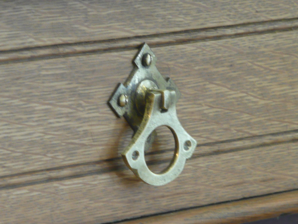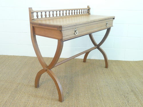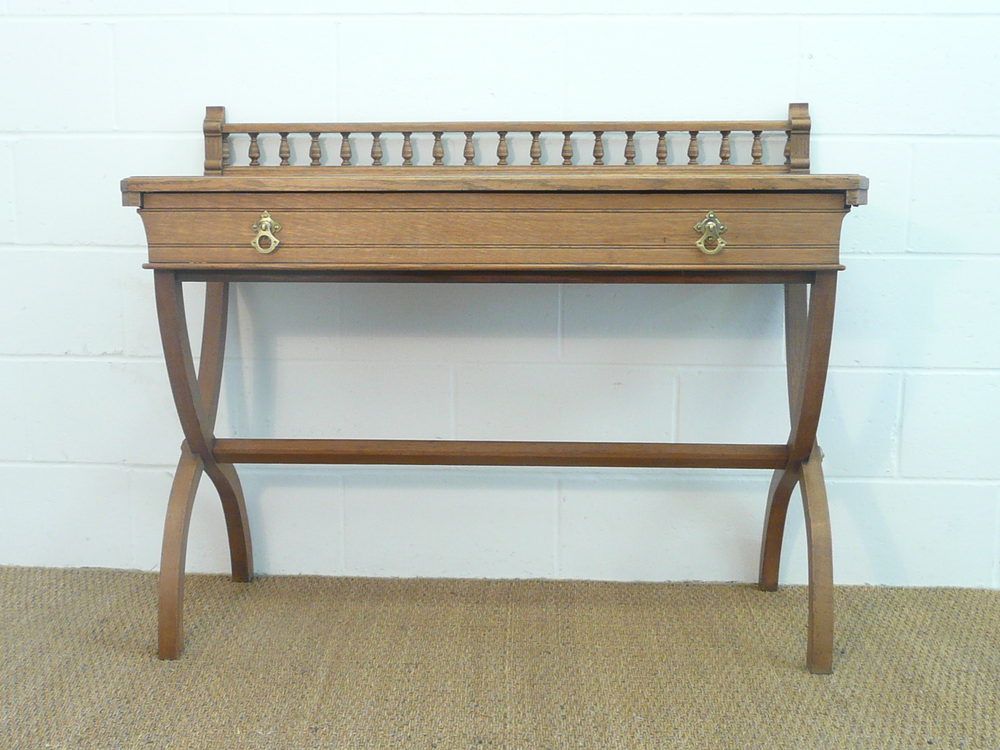 A Gothic Revival oak side table dating c.1875. Single full-width mahogany lined frieze drawer.