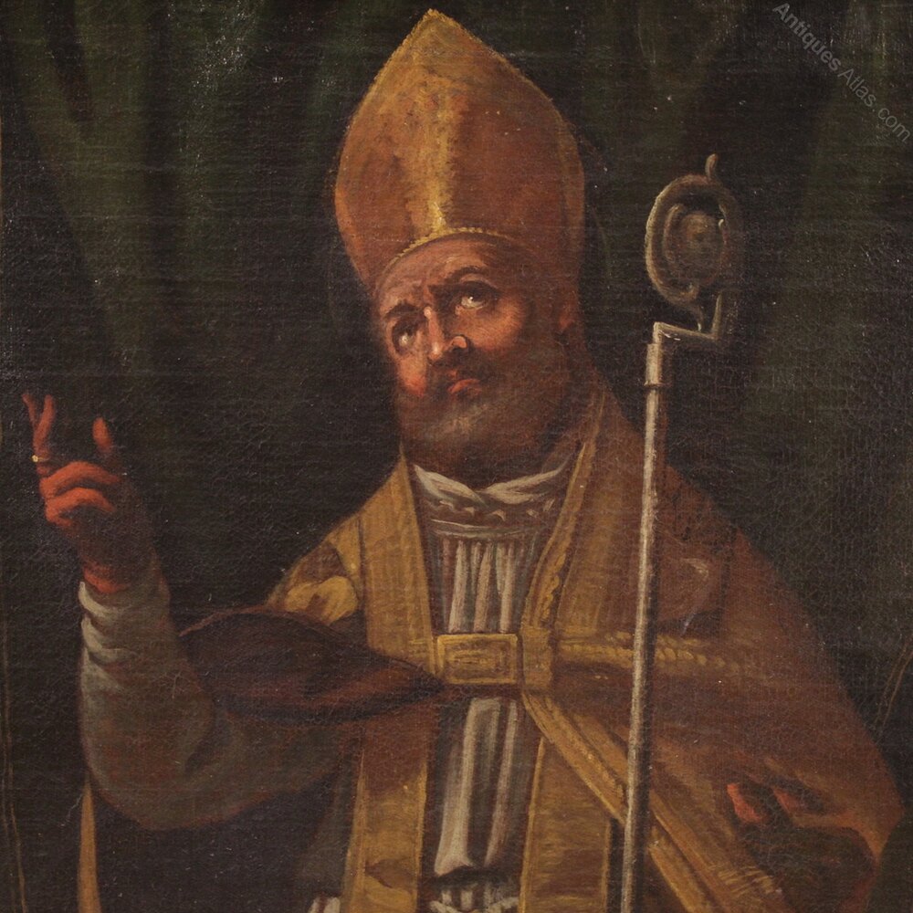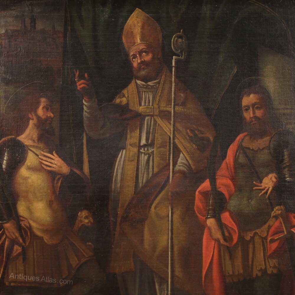 Antique 17th-century religious painting. Oil on canvas artwork depicting a trinity of warriors of the faith: Fermo, Proloco, and Rustico, beloved saints in Lombard tradition. At the center, Saint Proloco, dressed in episcopal robes, imparts a blessing to the two warrior saints flanking him, in a pyramidal arrangement of great balance and symbolic power reminiscent of the Lombard school.