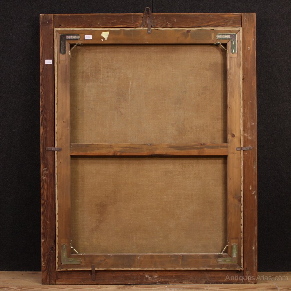 Scenographic 20th-century frame in carved, gilded, and lacquered wood, with some signs of aging. The painting has already been restored with re-lining, replacement of the stretcher, and restoration of the color in small areas. Overall, in good condition. Interior size H 116 x W 89 cm. As each of our products will be accompanied by a certificate of authenticity and warranty and photographic documentation. Every item will be packed in a custom-made wooden box. Free shipping in Europe and UK (import and custom duties NOT included). Worldwide shipping at affordable prices, ask us a shipping quote. BUY IN INSTALLMENTS INTEREST FREE.