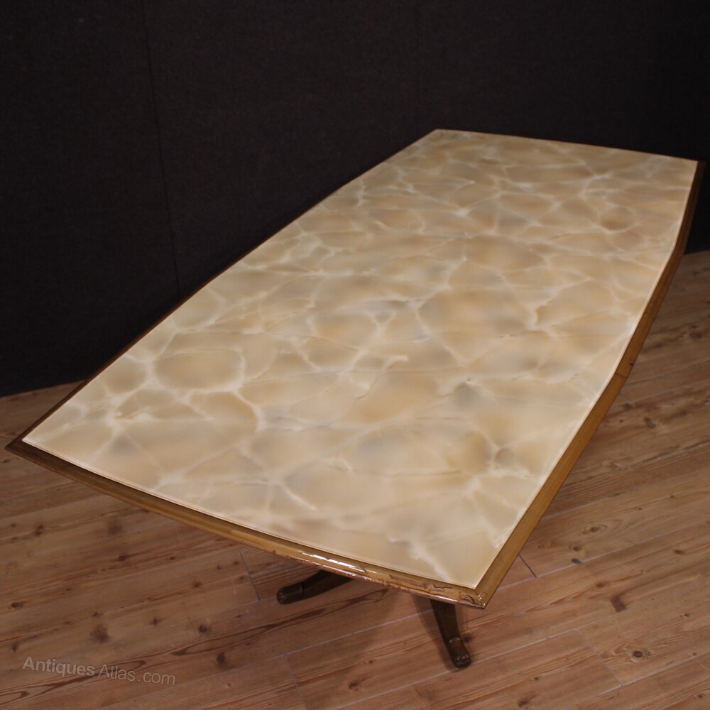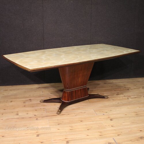 Great Italian dining table from the mid-20th century. Beautifully designed and beautifully furnished, made by Fratelli Rigamonti Desio, Milan, in the 1940s. Excellent size, quality, and service table with the original top with inset marbled glass. The mahogany base rests on four feet with brass zoomorphic decorations and a palisander veneer central column. This table comfortably seats eight, suitable for antique dealers and interior decorators. The table has minor signs of wear on the base and edge (see photo). Structurally sound, the table is in good condition.