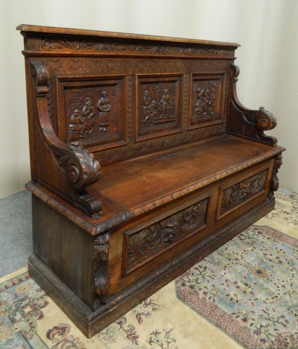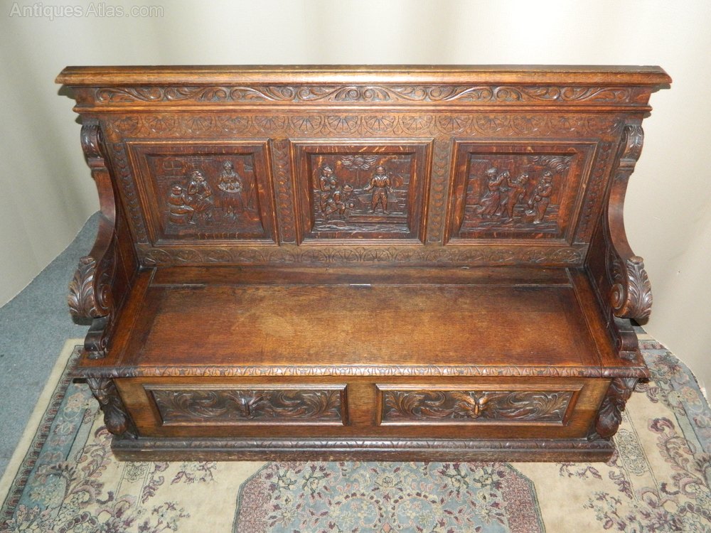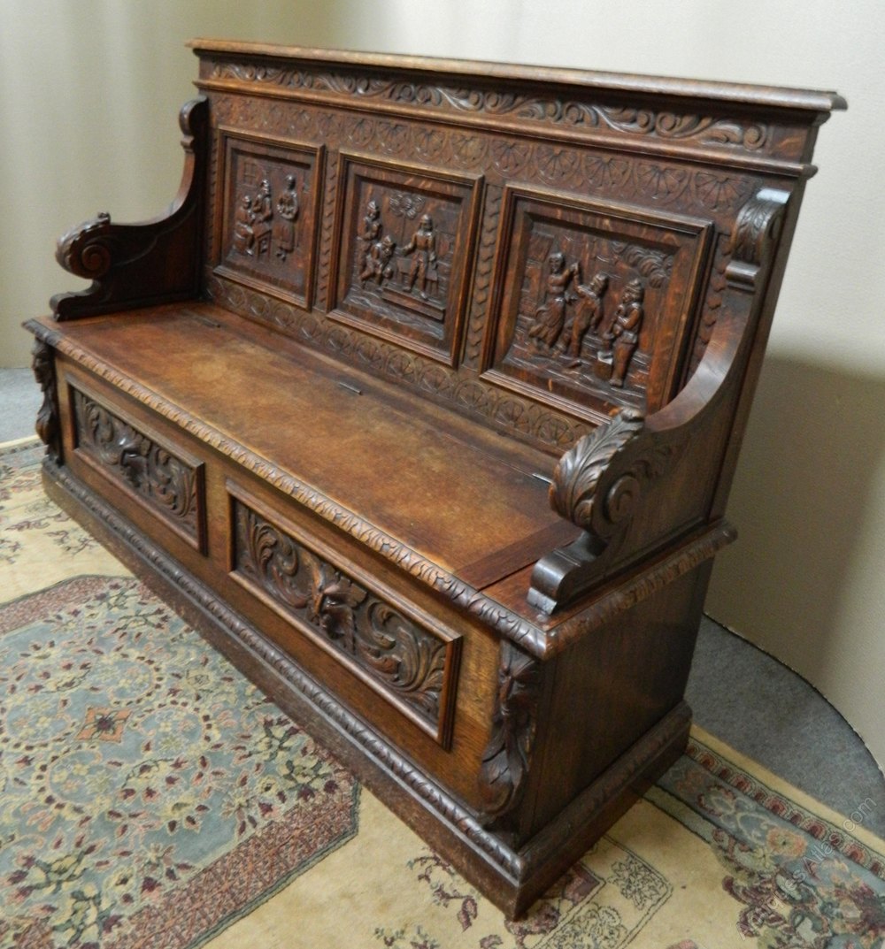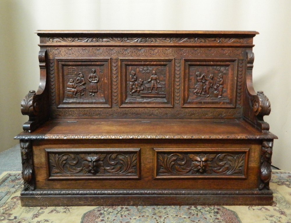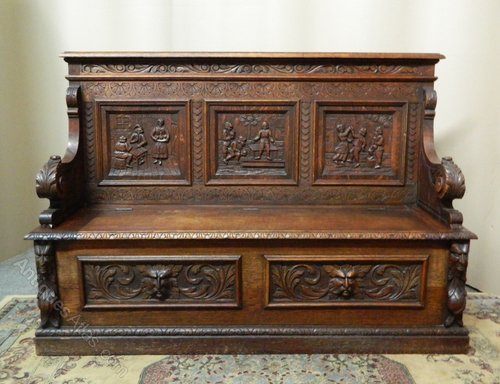 The back panels depicting scenes of men drinking in an inn carved in relief, carved scroll arms and wonderful green man masks to the base, the seat has lift up lid and large storage compartment below ..