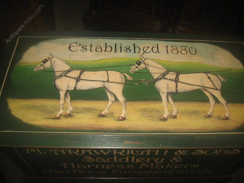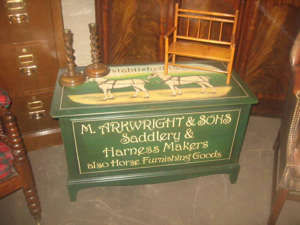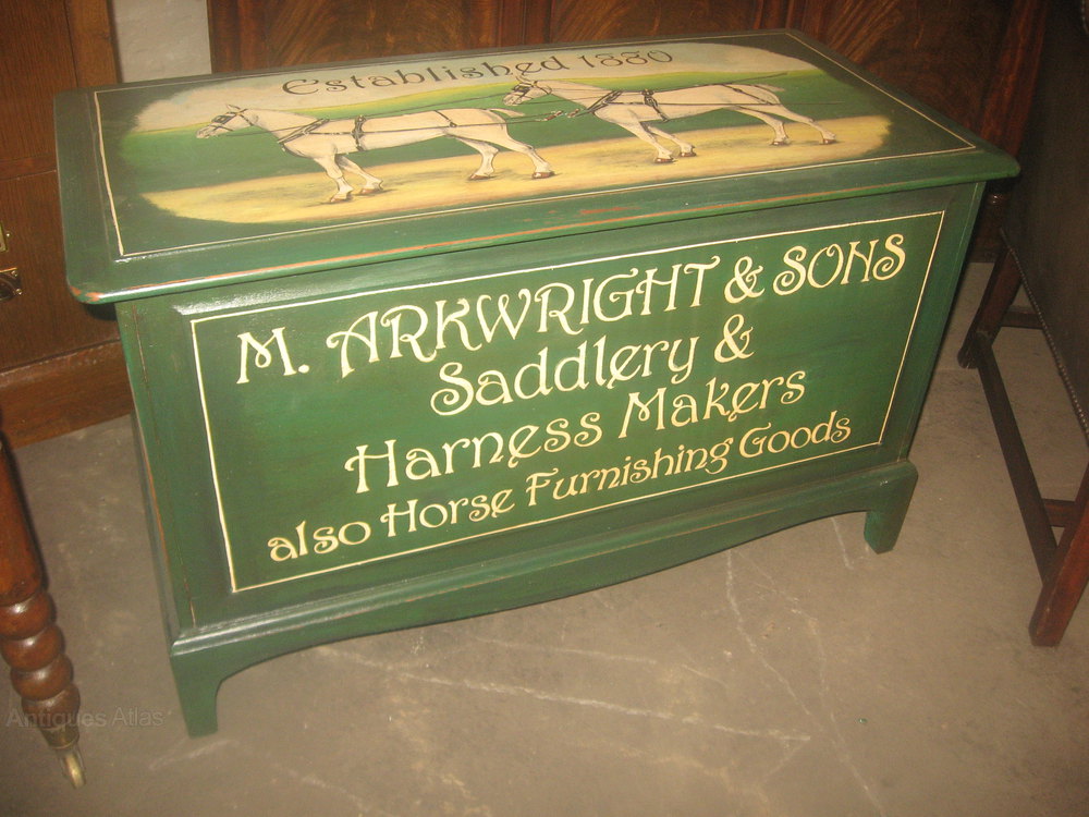 Decorative hand painted Blanket Chest, a work of art in the making. Edwardian style lettering in appearance, and complete with a distinct equestrian design.