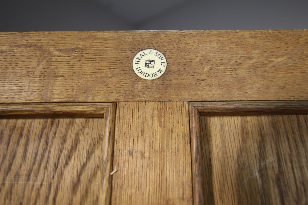This is a superb quailty, solid English oak wardrobe by Heals of London in the twenties, fully fitted inside with hanging rails, shoe racks, four cedarwood lined drawers, a trinket box, tie rack and an adjustable height shelf. Inside one of the wardrobe doors is a dressing mirror and the large Heals makers label is inset. In very good, clean condition throughout, This large Heals oak wardrobe has two long, well panelled doors and it stands on square oak feet. A great piece of Heals oak bedroom antique furniture.