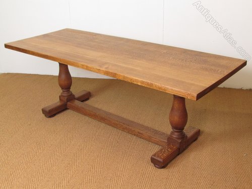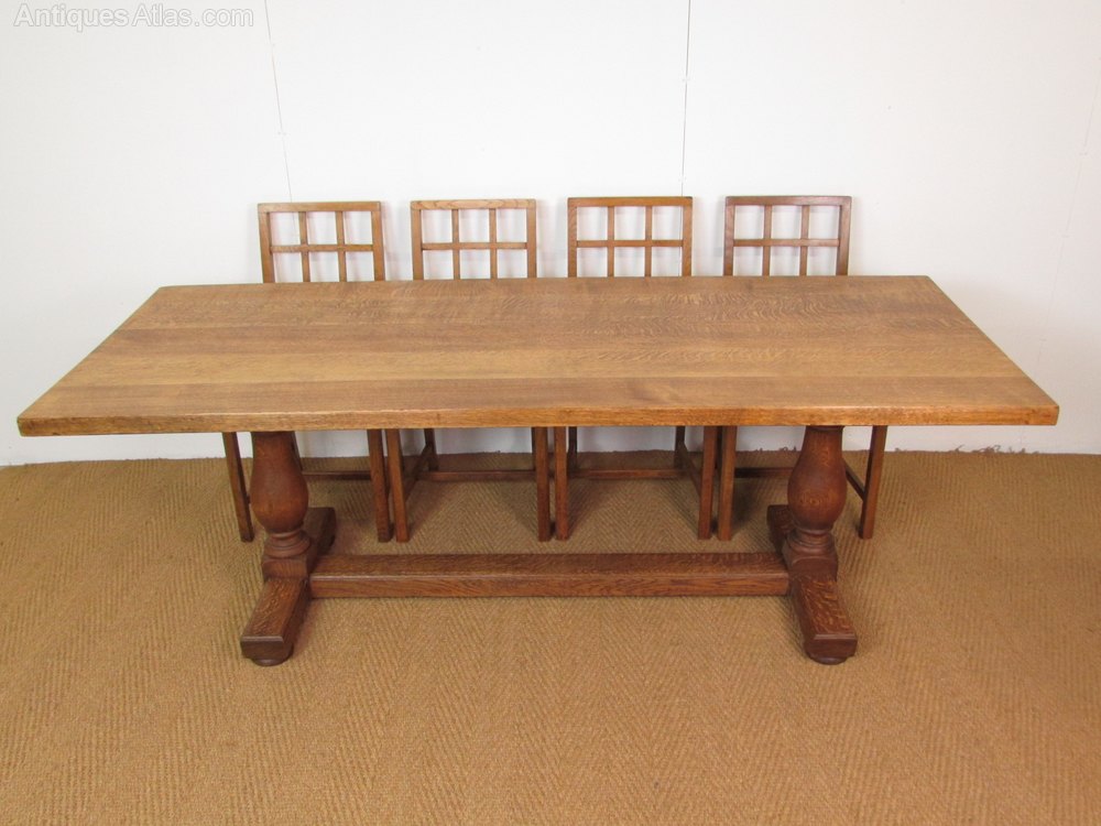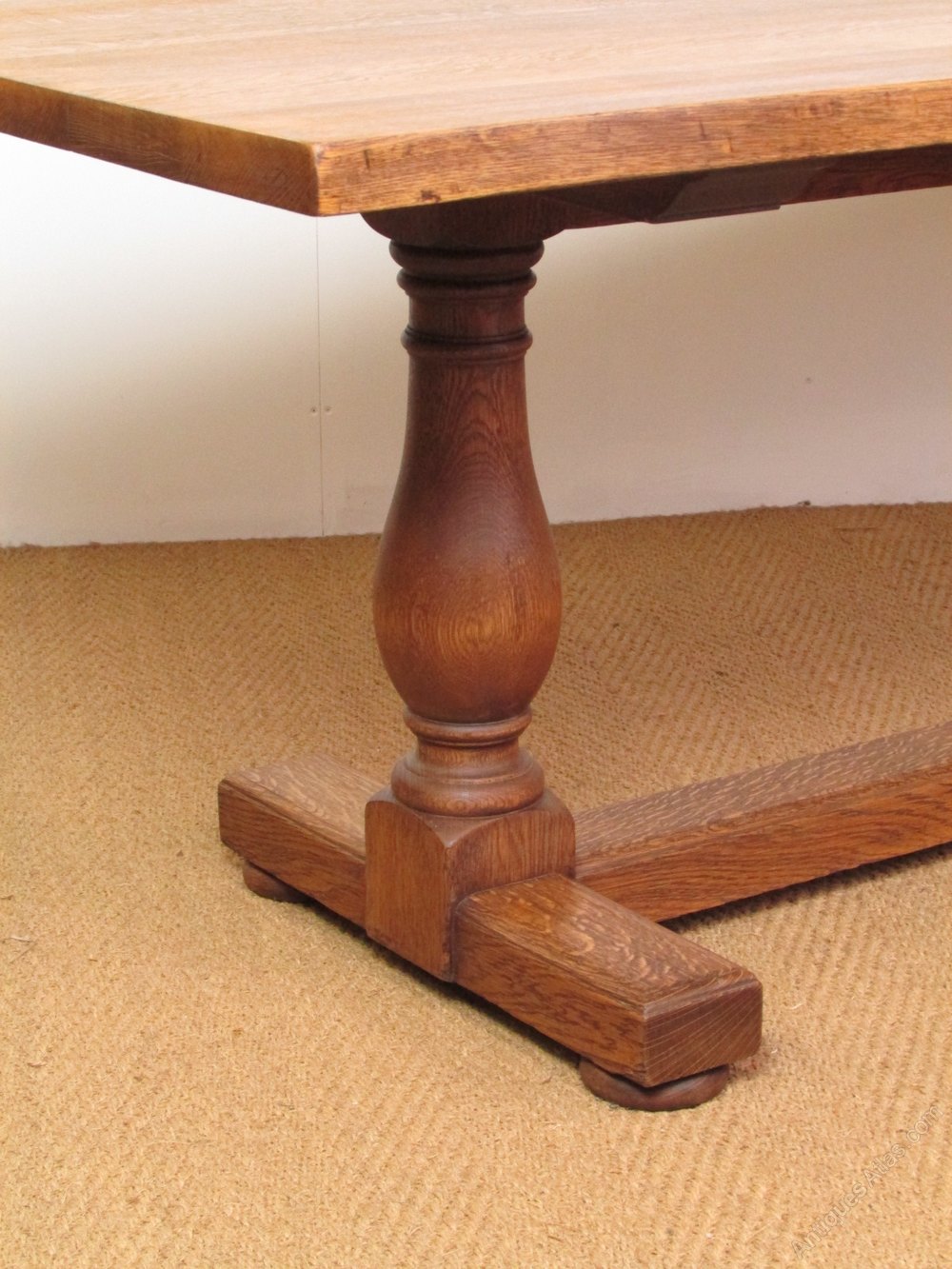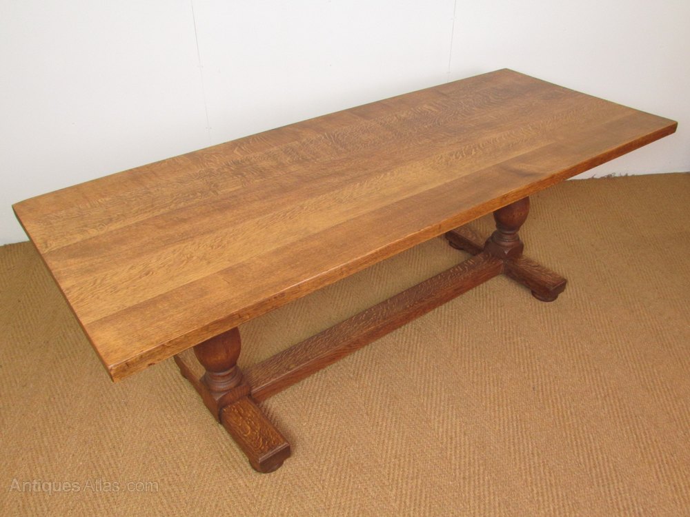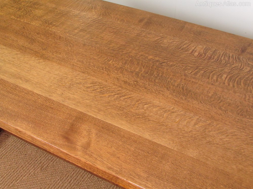 The table: An oak refectory dining table by Heal's c.1925. Labelled. Constructed in solid, well figured quarter sawn oak with superb proportions.