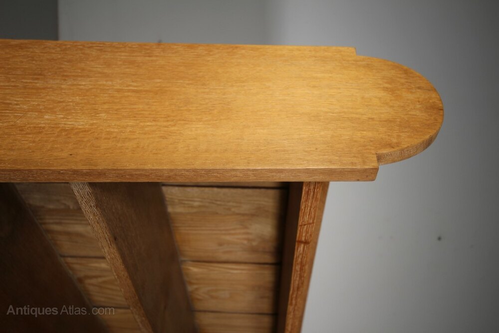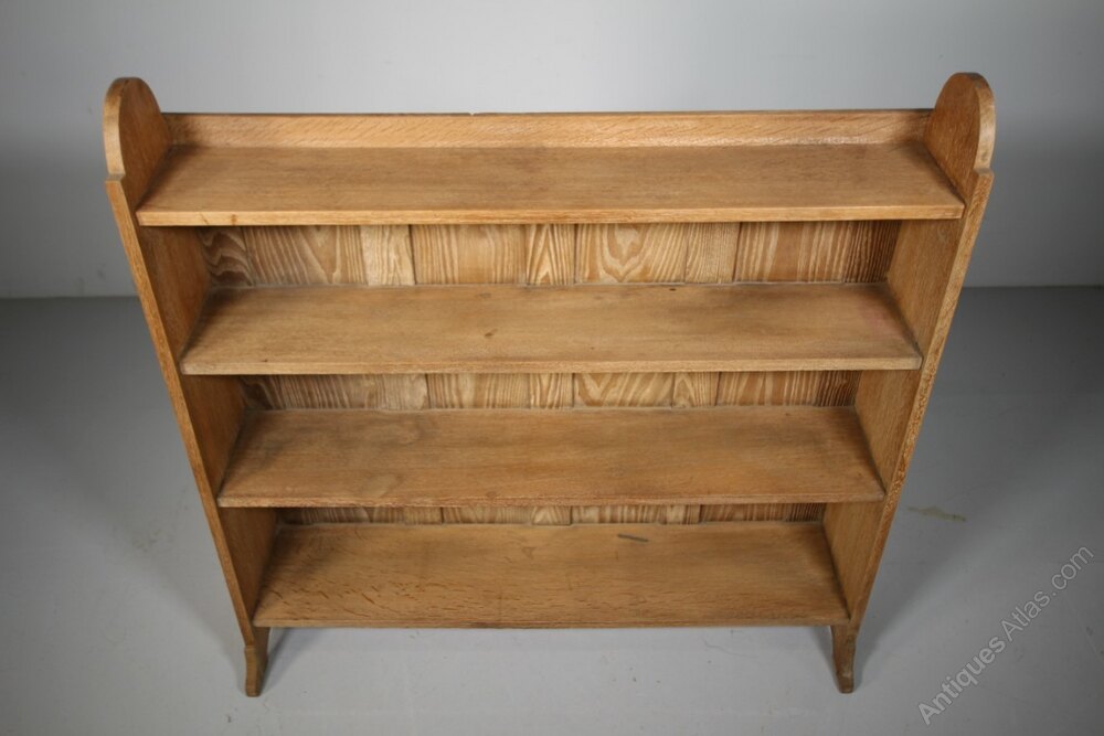 A large excellent quality, solid oak antique open bookcase by Heals of London around 1915-20. In superb, clean condition and having the original Heals makers label inset into the back. Featuring four, tapering book shelves, they taper in depth being, 20cm deep, 21.5cm, 23cm and 24.5cm. Stands firmly on shaped ends and the back boards are beautiful sweet chestnut timbers. A lovely piece.