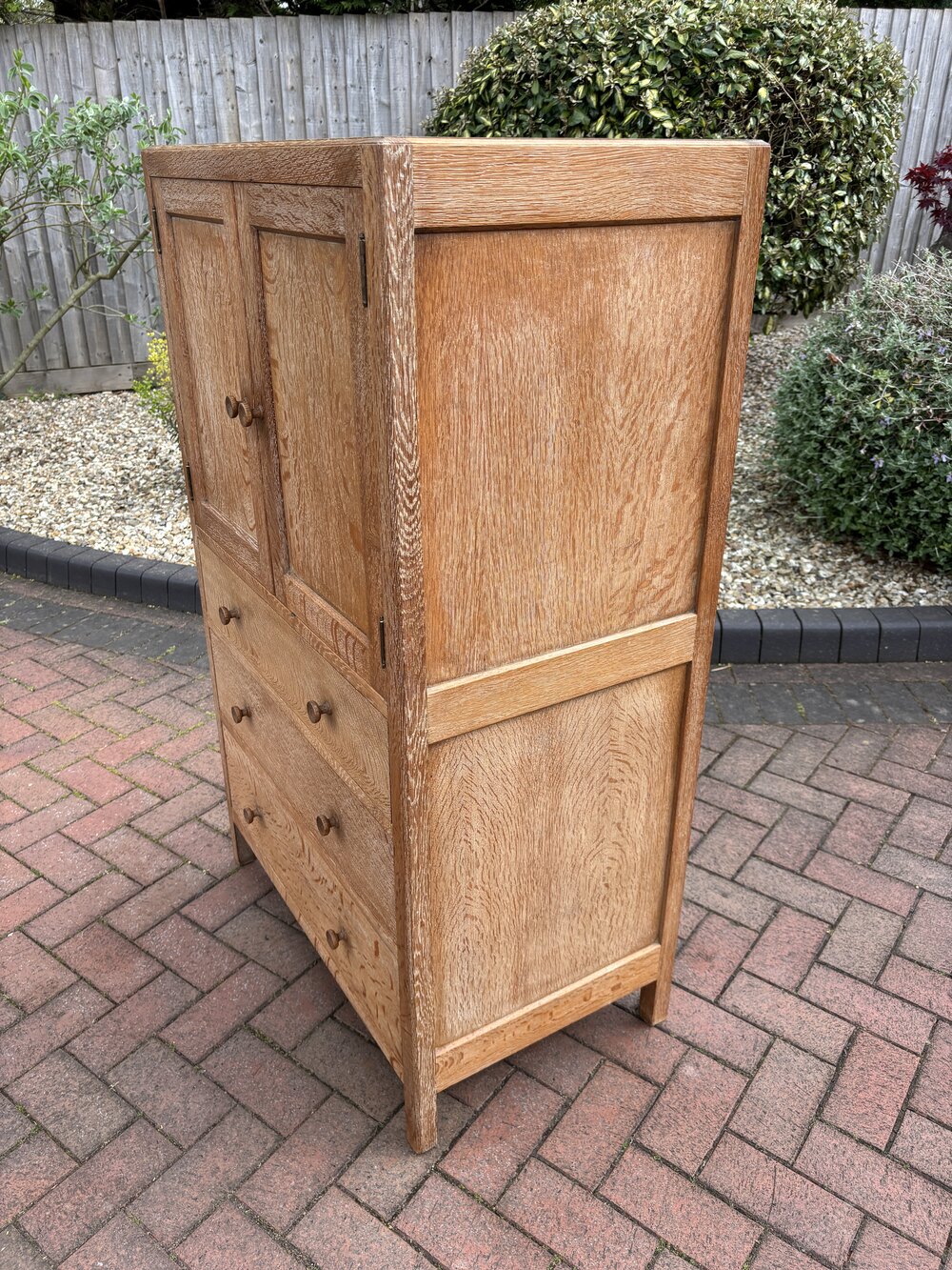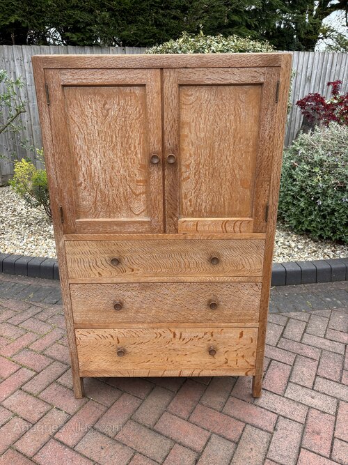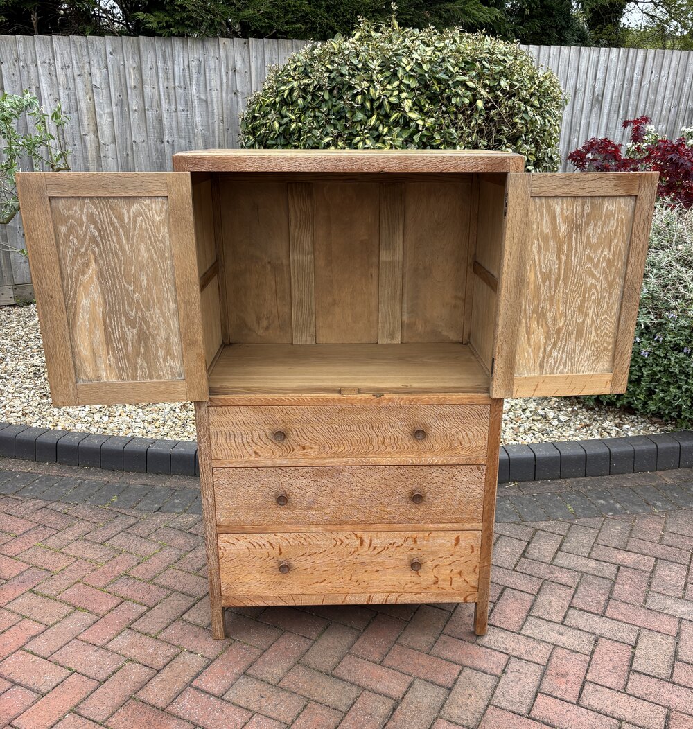 Cotswold School quarter sawn limed oak tallboy cupboard by Heals of London c1930's. Two panelled doors over three graduating drawers, panelled sides, turned handles and stands on square section feet. Although unlabelled, a recognised Heals tallboy.