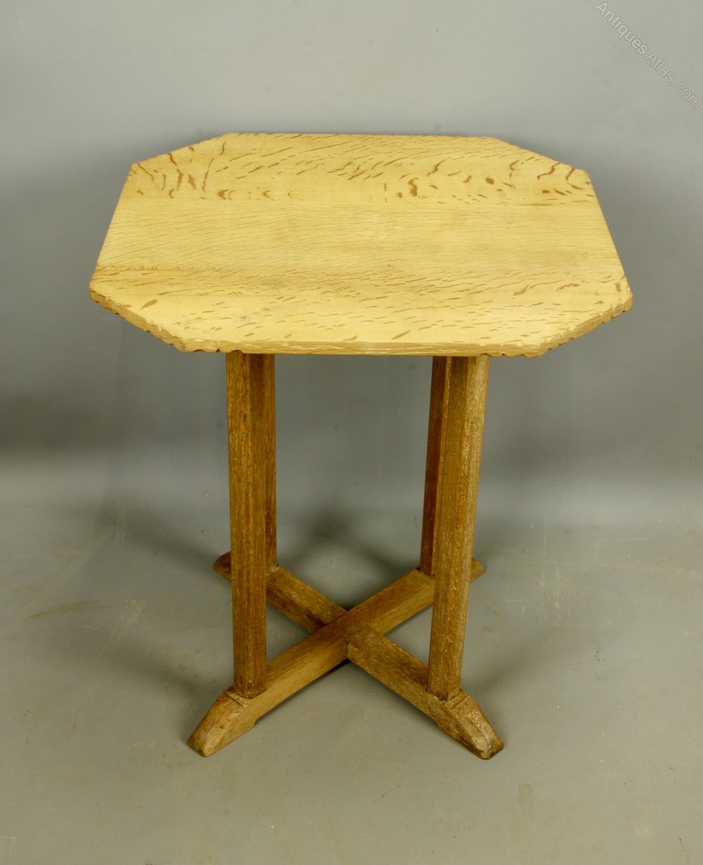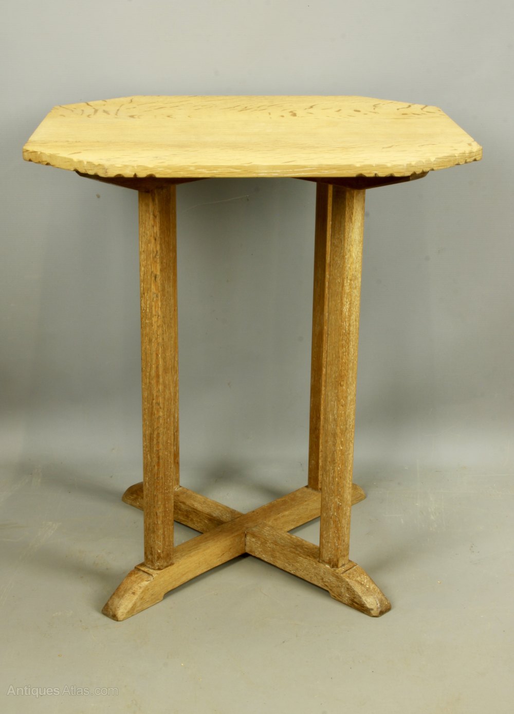 A Heals pale oak occasional table, with chip carved edge to top, dating to circa 1925. A known design, it is unmarked save for the stamped number 85 to the base of the stretcher. Offered in good condition, commensurate with age, there are traces of liming wax to the legs but a pleasing colour overall now. It measures 58.5cm high, and 51.5cm max across the top.