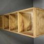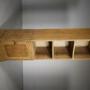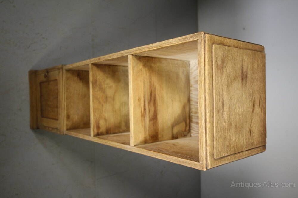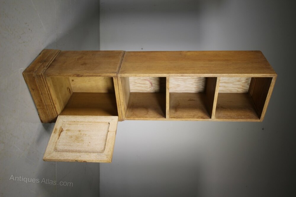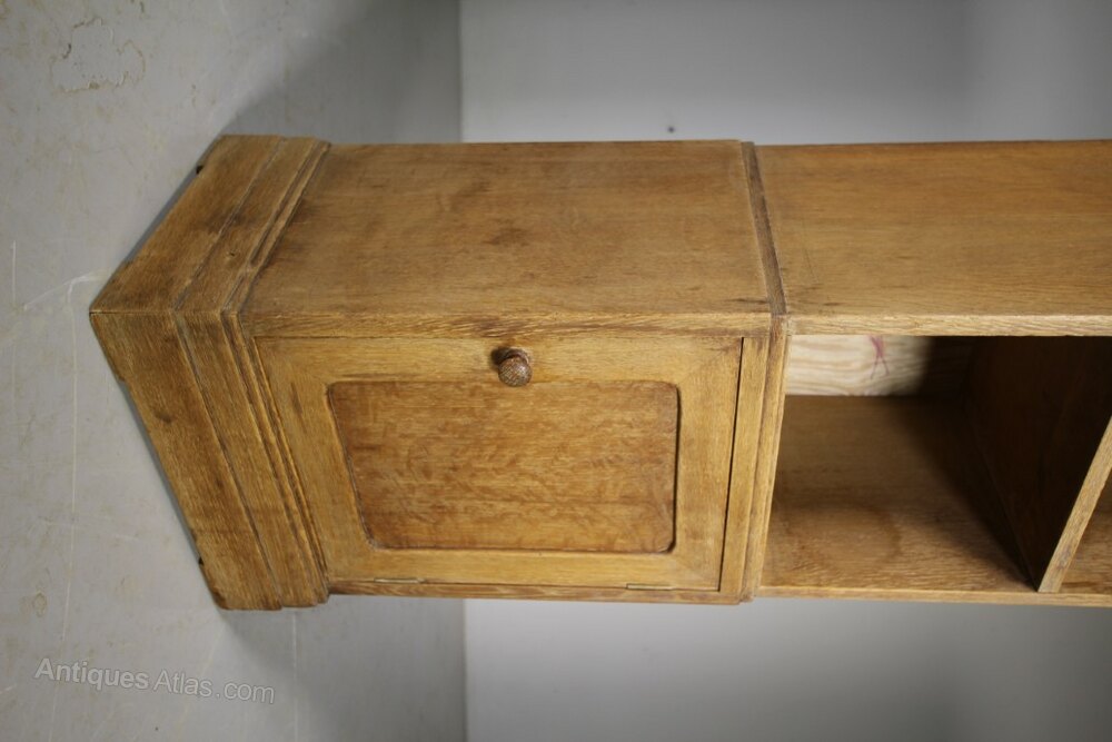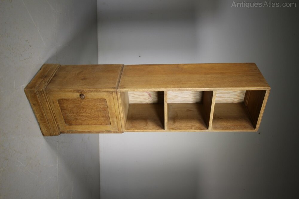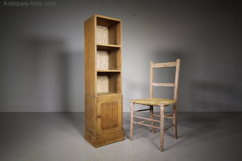 A tall English antique oak bedside cupboard by Heals around 1920, a rare model having a solid oak cupboard door to the lower part with three open shelves / storage areas above. In very original condition, complete with the original oak knob door handle, stands on a square plinth. Lovely pale oak colour. A couple of small old marks to the shelves.