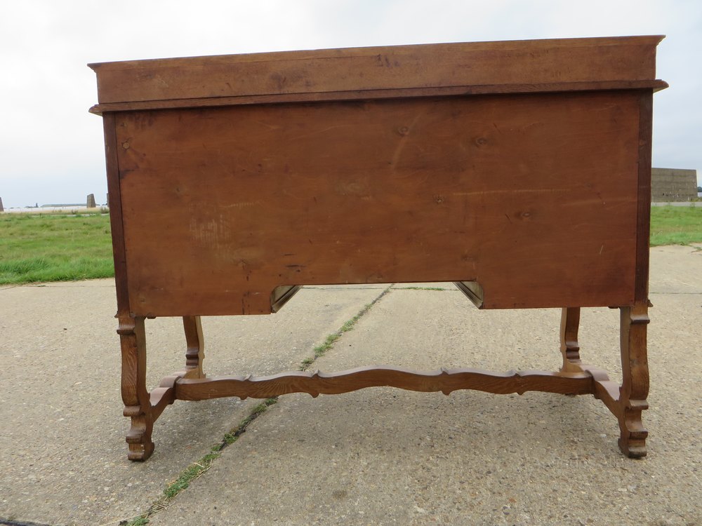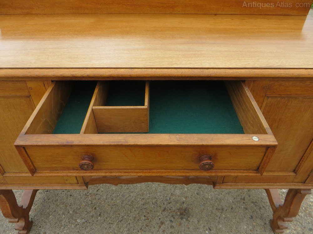 It has two end cupboards with original locks and keys, with three central drawers, the top one lined with green baize.