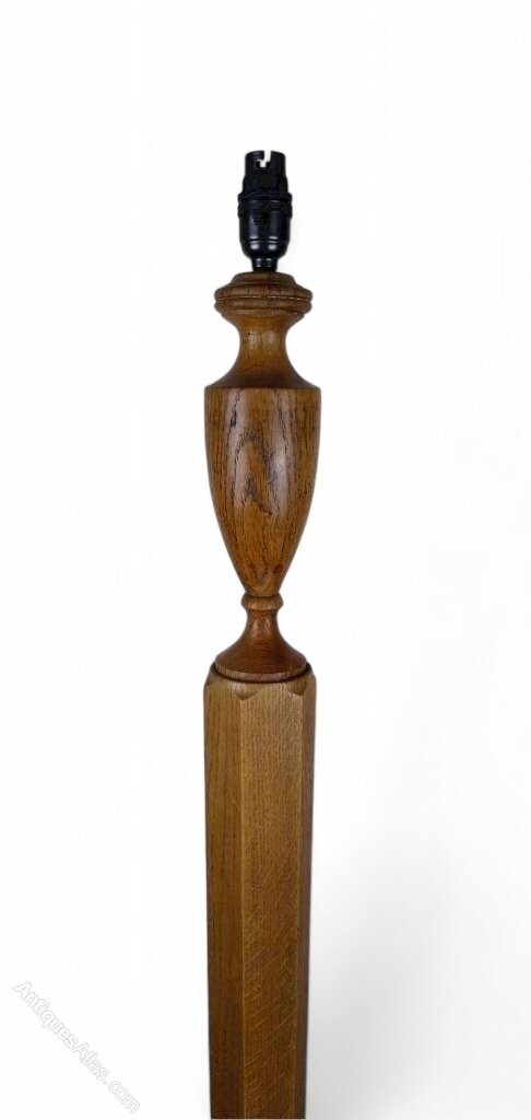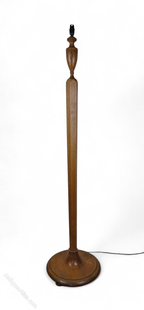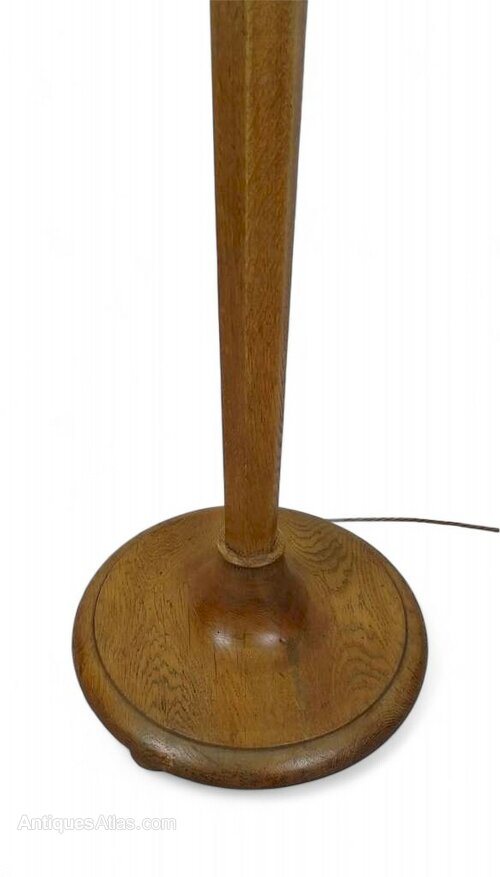 Heals standard lamp in weathered oak , hexagonal , tapering central column with a circular base and an urn shaped top , supported on circular bun feet . This has been cleaned and waxed , rewired with silk cord , PAT tested with certificate and is ready to plug in . Comes with a modern grey shade .