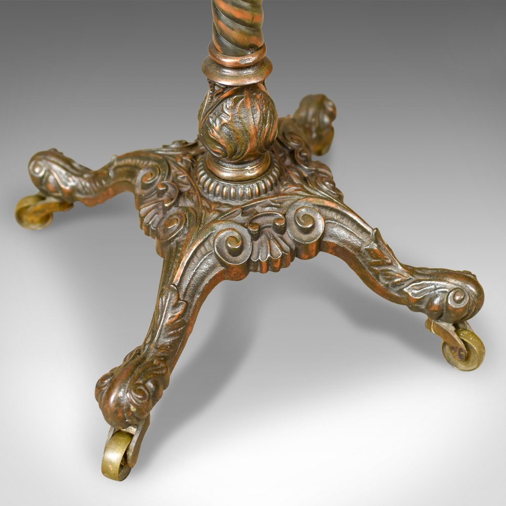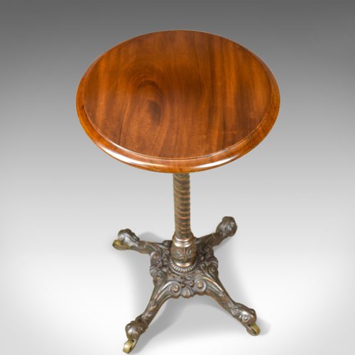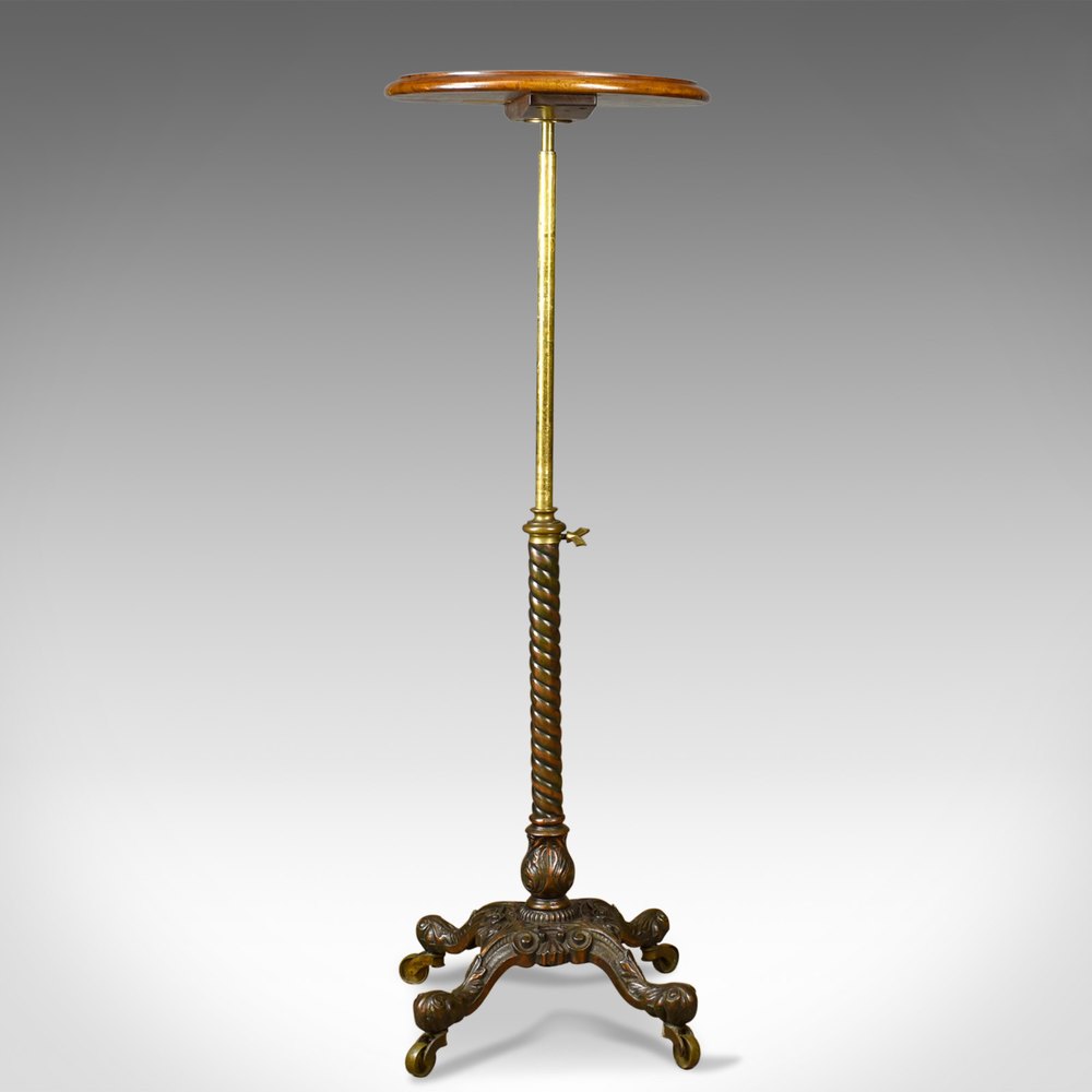 This is a heavy antique adjustable table, a Victorian plant stand or side wine table in mahogany, brass and iron dating to circa 1850.