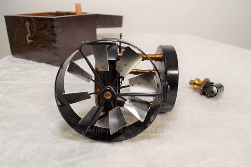 Early 20th-century medium-speed air meter (Anemometer) by Henry Hughes and Son Ltd. The dial reads air meter to 100,000 meters and incorporates three subsidiary dials measuring 100's, 1000's and 10,000's, with a large sweep hand which is graduated from 0 - 100. Henry Hughes and Son Ltd became Kelvin and Hughes in 1947, so we can date this example to before that date. The mahogany fitted case is also in sound condition and still has the spigot attachment. All the aluminium vanes are undamaged and spin very easily.