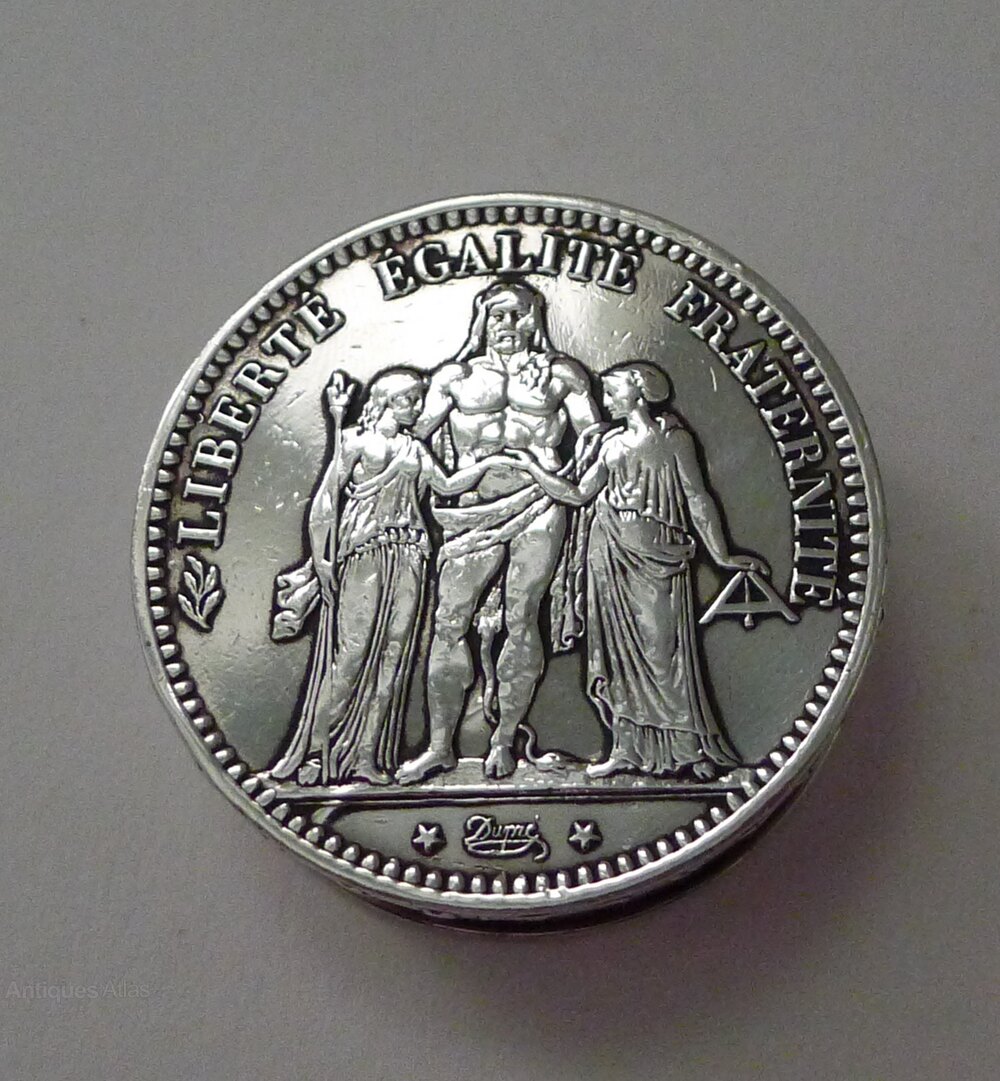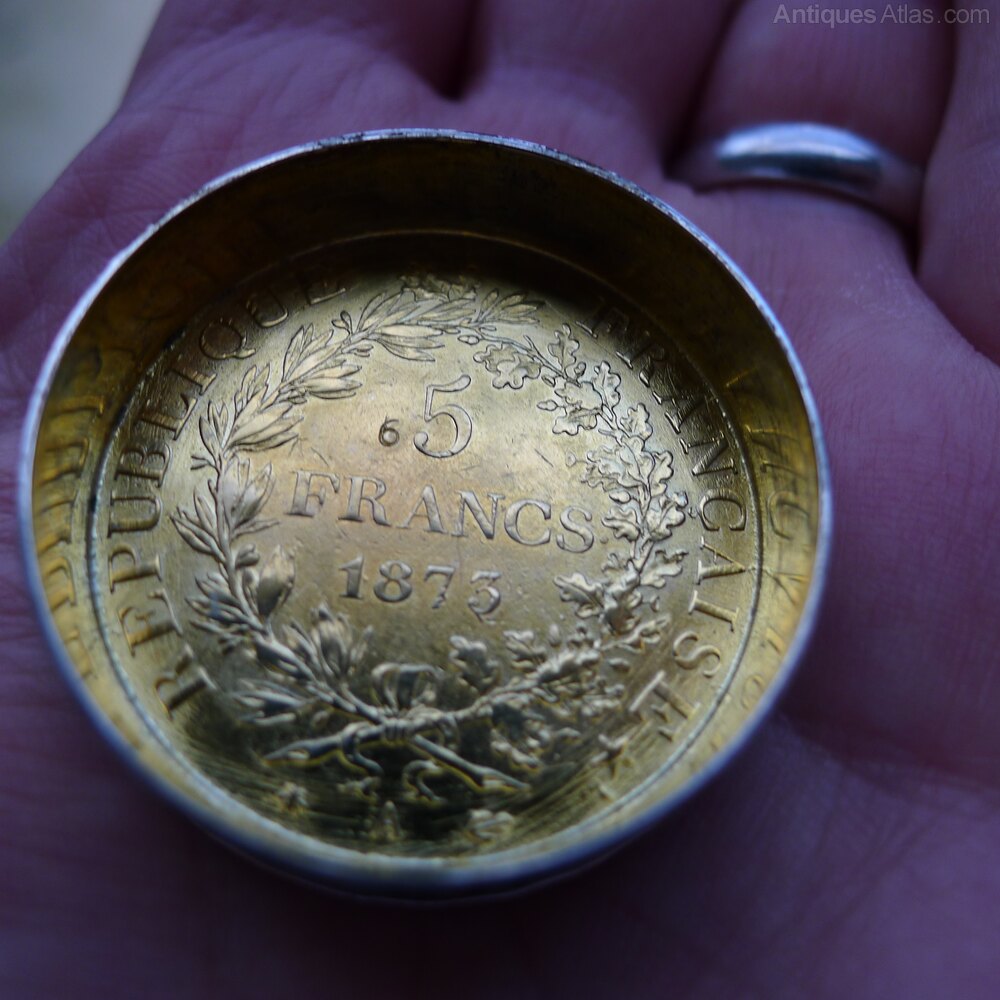 The lid is inset with an 1873 5 Franc coin, the interior for both base and lid retaining it's beautiful original gilding. A lovely heavy piece and beautiful quality to be expected of both Hermes and Ravinet d'Enfert.