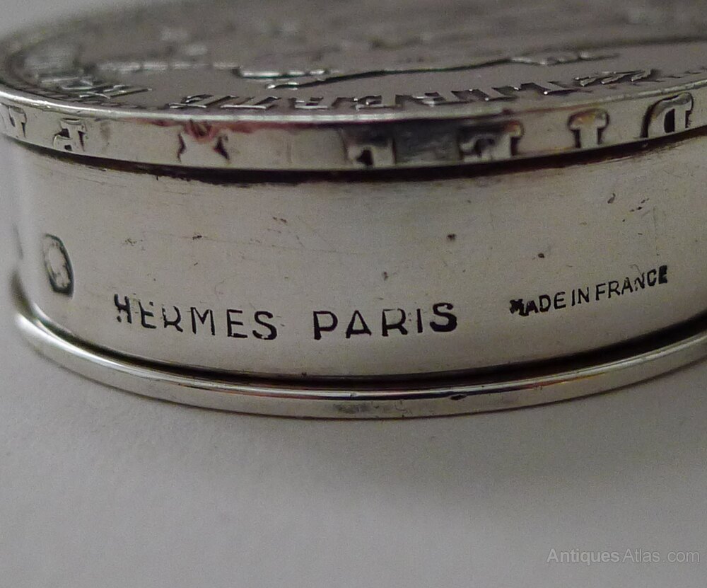 From the iconic French luxury retailer, this solid / sterling silver box was made by Hermes of Paris, fully signed on the side of the box together with the Minerva head mark (silver) and the maker's mark for Ravinet d'Enfert (closed in 1984), the box dates to c.1950. Also marked Made In France.