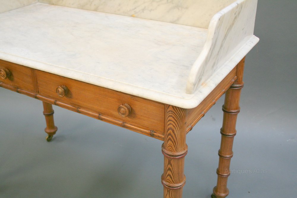 By the much sort after cabinet makers Holland & Son (stamped and remnant of label) this stylish late 19th Century red deal writing hall table is turned as faux bamboo with a white marble top.