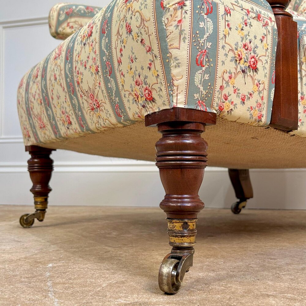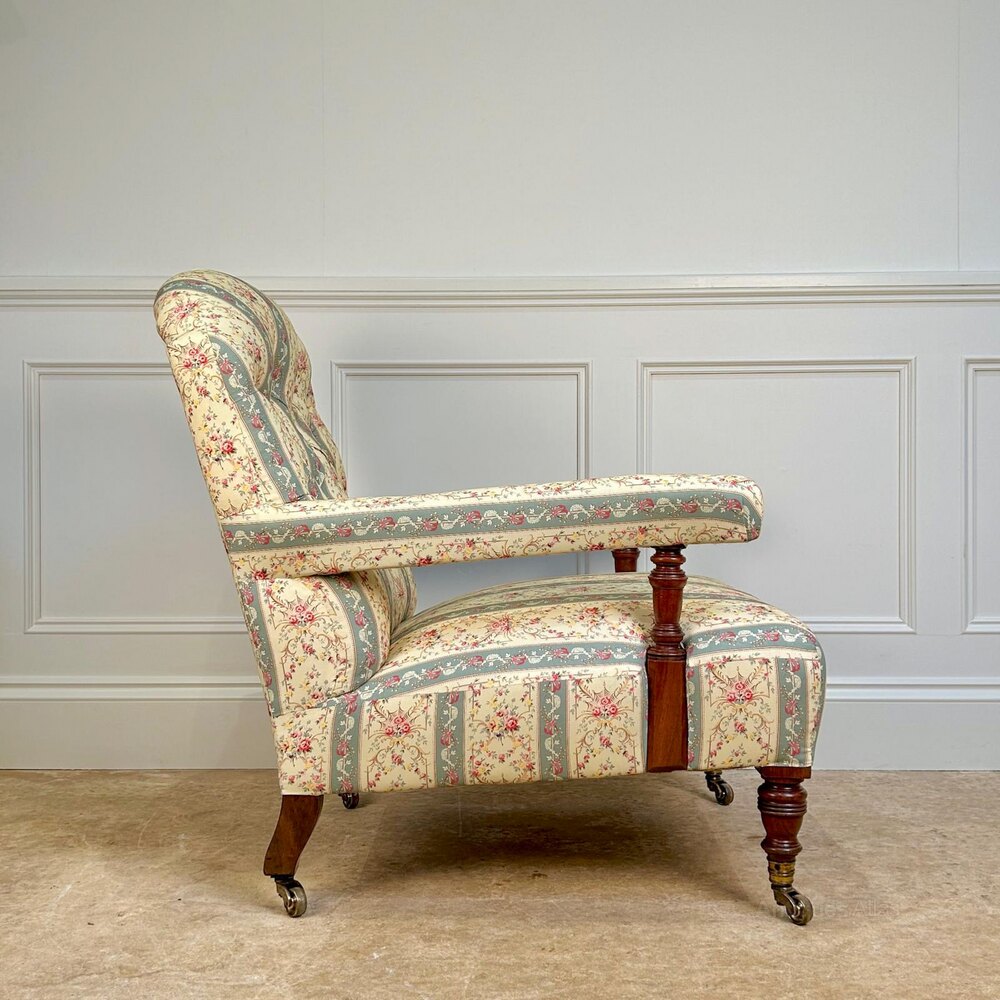 A Howard & Sons walnut open armchair. This lovely chair retaining the original horsehair and sprung seat and re-upholstered in our Howard & Sons striped ticking. This particular model with a stamped Howard & Sons Ltd, Berners Street and numbered back leg. Raised on turned walnut legs with the original gilt lacquered stamped brass castors. English, Circa 1900.