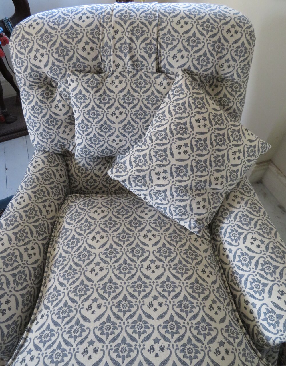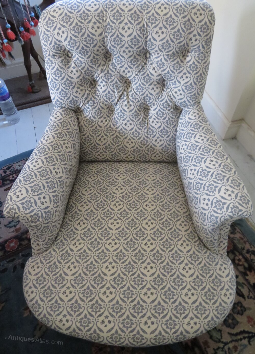 Howard club easy armchair,late 19th century. Completely restored in howard and sons ticking. Extras include a small scatter cushion and an unusual adjustable head restraint for extra comfort. Piped feather cushion all horsehair upholstery. Inside rear leg stamped howard and sons,berners st with serial numbers and all four castors stamped. Mahogany tapering front legs. A very comfortable sit. Height of back 31 inches, (79cm)