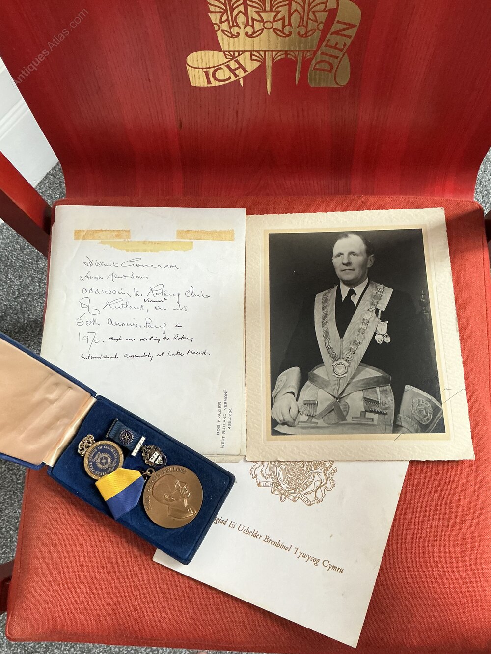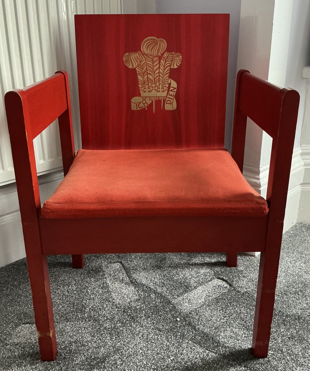 A historic investiture chair designed by Lord Snowdon for the HRH Prince of Wales in 1969. Crafted in red-stained ash, elm, and plywood, it features an upholstered seat and the Prince of Wales fleur-de-lis stencilled to the back, combining elegance with royal heritage. This piece is a rare collector’s item for enthusiasts of royal memorabilia, mid-century furniture, or design history.