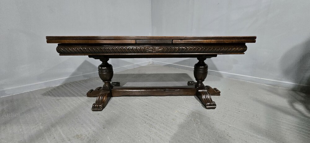 A superb huge Elizabethan style extending draw leaf double pedestal oak dining table, 2 inch thick top, peg jointed throughout, carved freize, lovely home ready condition.