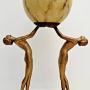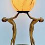 A superb, scarce and stylish Art Deco table or desk lamp of two dancing ladies in cold painted spelter holding aloft its original Loetz type veined glass globe mounted on a oval alabaster base.
