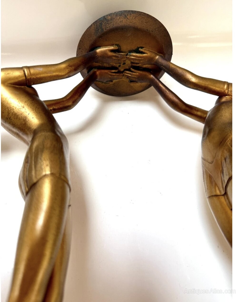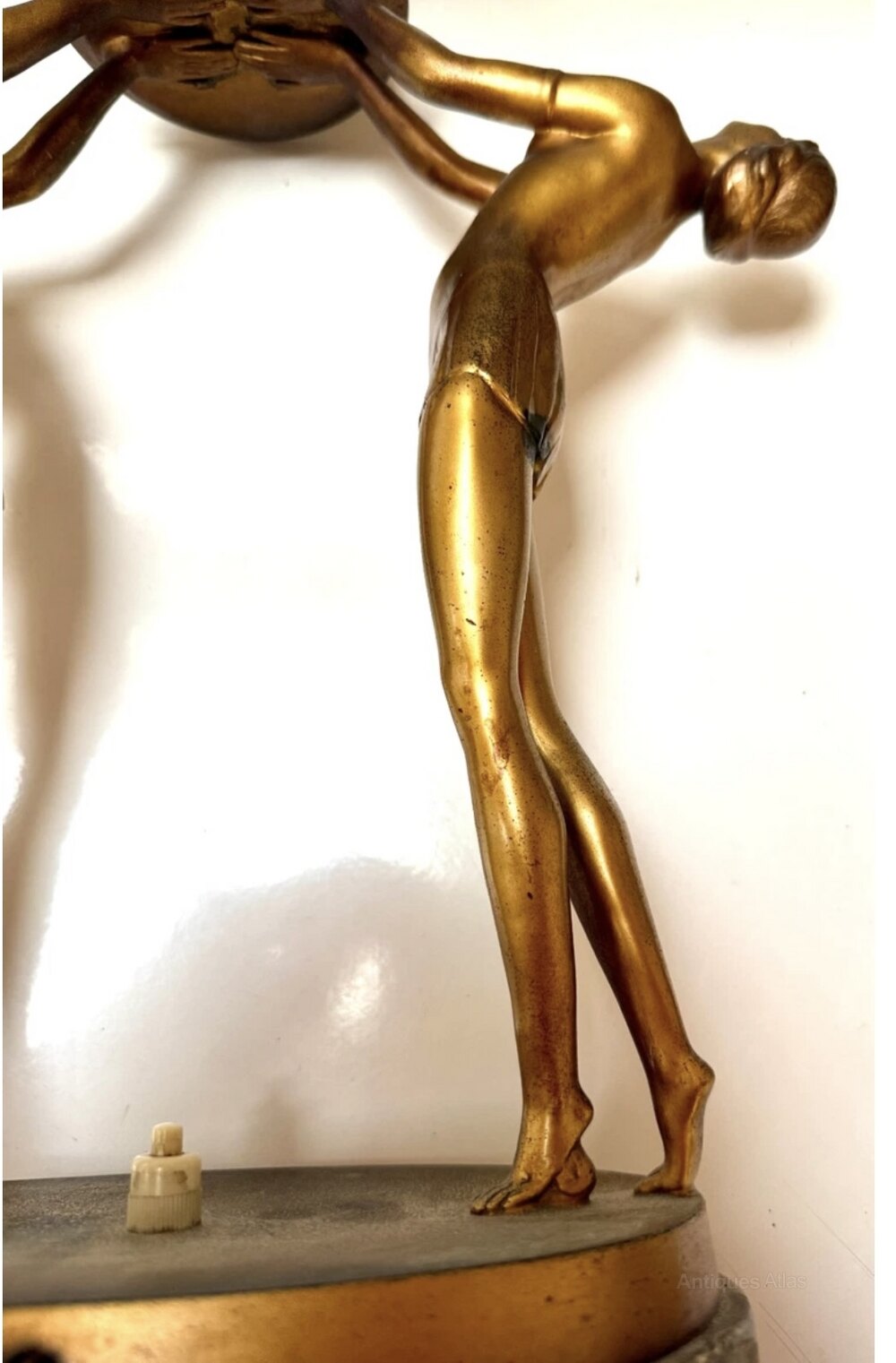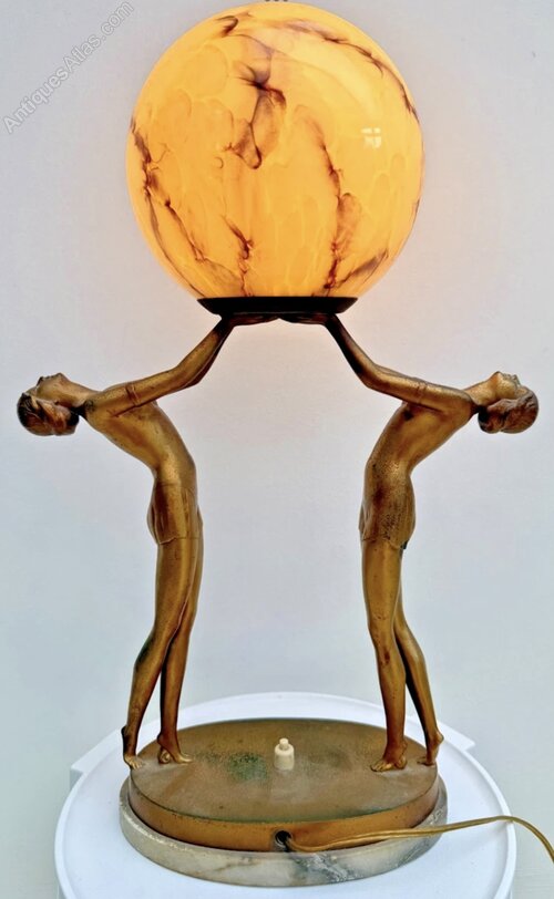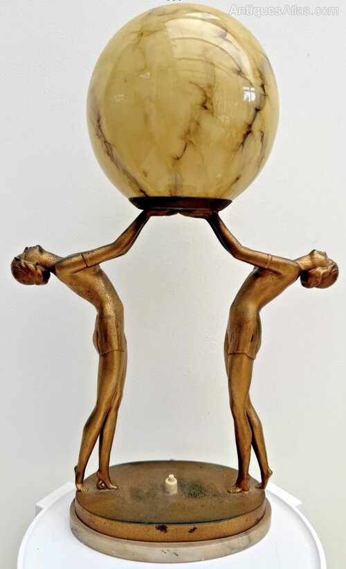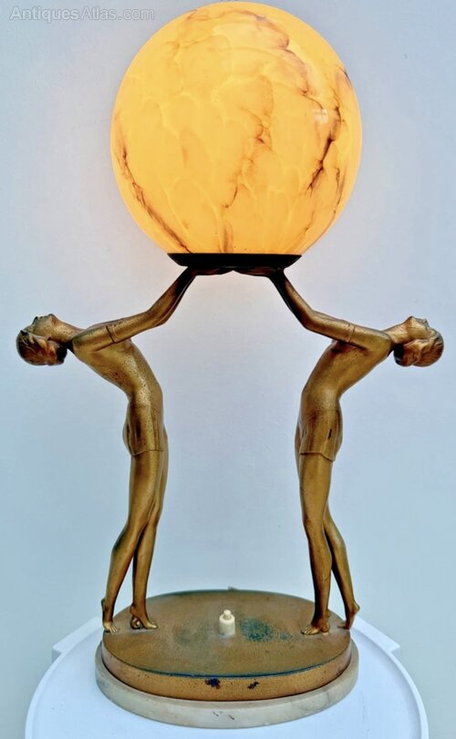 The iconic and striking design is one of the most coveted examples of Art Deco lady lamps available and the figures are crisply modelled retaining their original paintwork. The globe shade to the lamp is in wonderful condition.