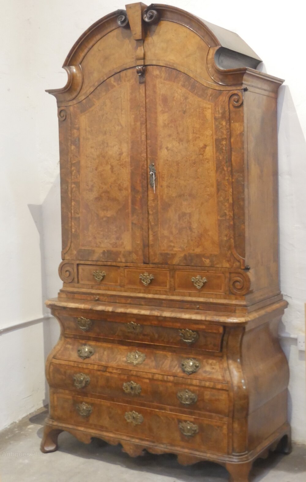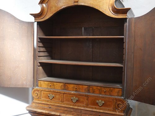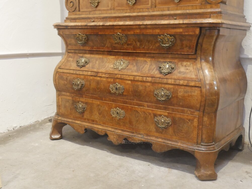 A very impressive 18th century Dutch walnut two part cupboard, made in Amsterdam. Adjustable shelves to the top, with drawers beneath, a bombe shaped chest to the base, oak lined, the cabinet shows similarity to a Dutch cabinet in the Rijksmuseum, in Amsterdam/