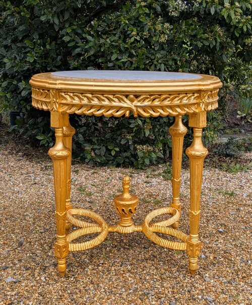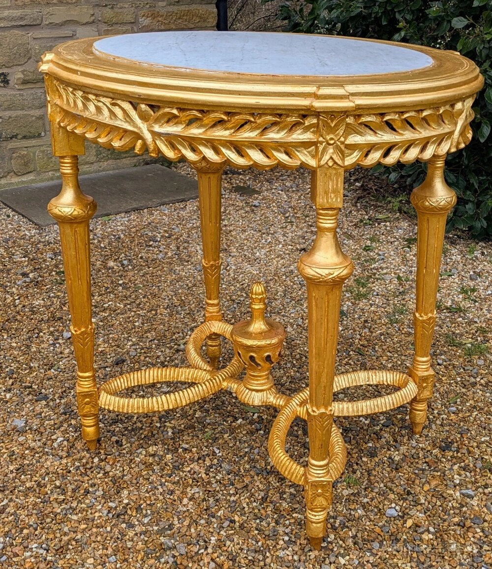 The oval table is in excellent condition made by the company Dauphine Harrison and Gill and has their lable to the underside of the marble. The decorative frieze is foliate carved and pierced with the table being on reeded fluted legs which are joined by ribbon form stretchers carved as a large bow.