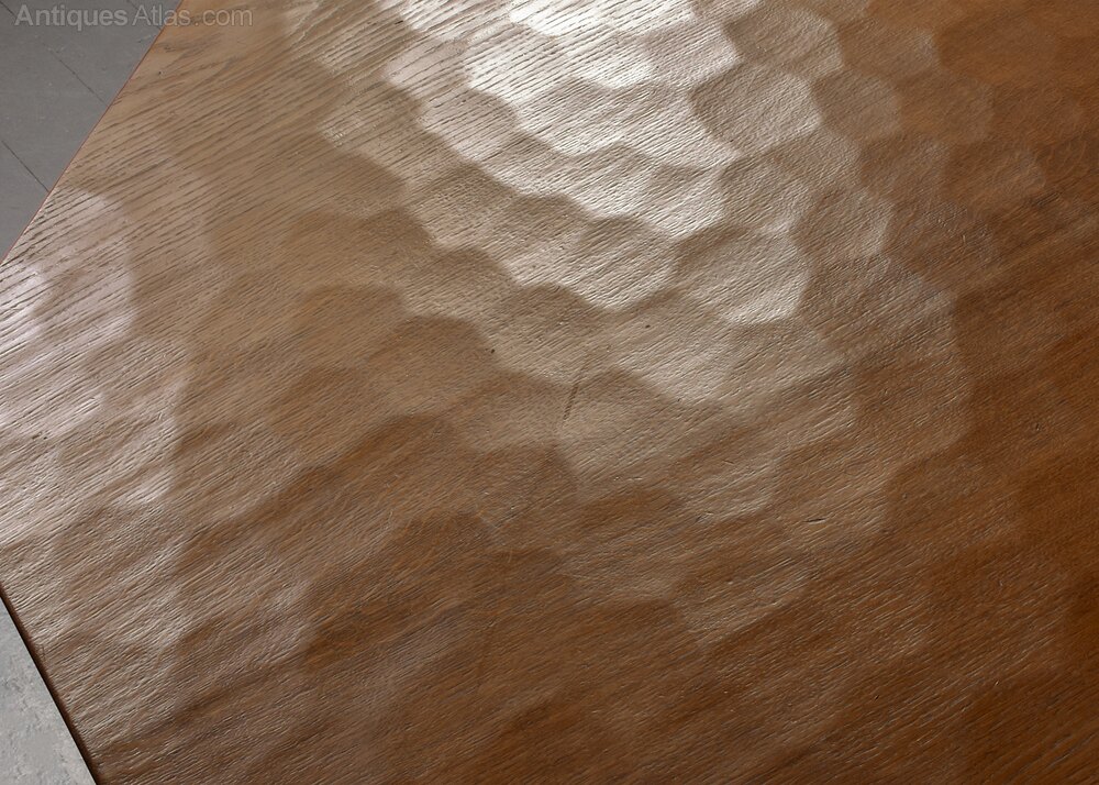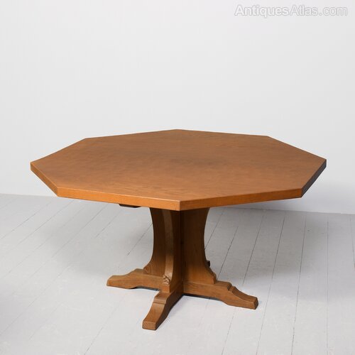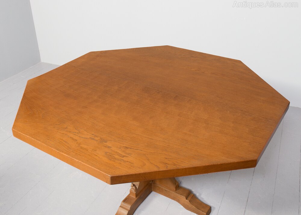 Circa 1960s. Impressive large handmade Yorkshire “critter” Foxman (Don Craven, Oldstead, Thirsk- ex Robt Thompson)_ hexagonal oak dining table. The 4.5cm thick, solid hexagonal top in a lovely, figured oak and with adzed finish with good colour and patina, supported on a cruciform plinth with the signature carved fox, over shaped plinth bases. Lovely original colour and patina. Comfortable seats 8.