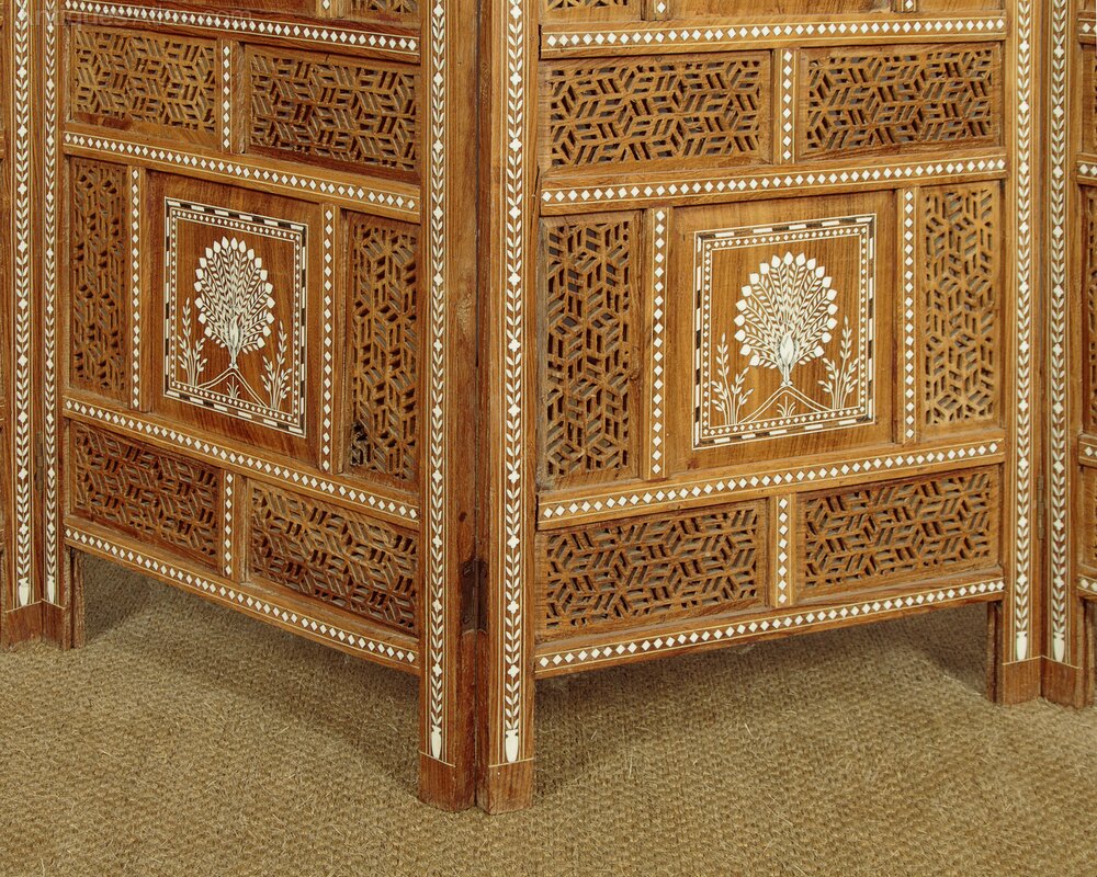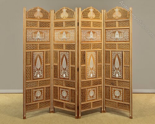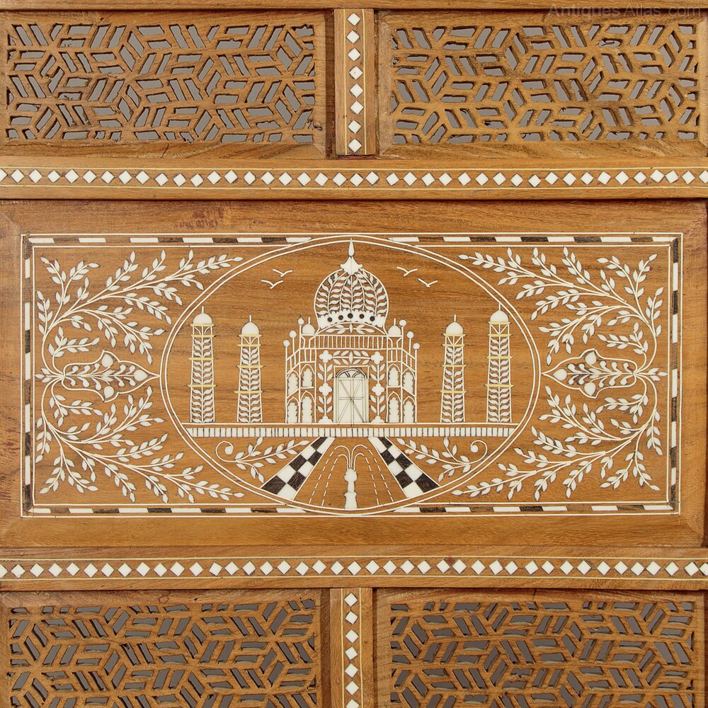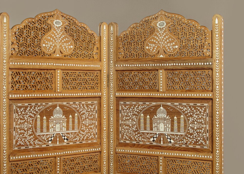Indian teak folding screen or room divider. Four 20" x 68" sections with hand-cut geometric pierced fretwork panels and white inlaid decoration of the Taj Mahal and classic Indian motifs The Tree of Life and peacocks. Note also the Mughal arch shaped tops and how the inlaid decoration continues on the front and outer edges of the frame. Brass hinges. Excellent condition.