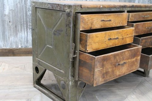 The drawer unit features a metal frame with a worn green paint finish, and has several timber drawers.